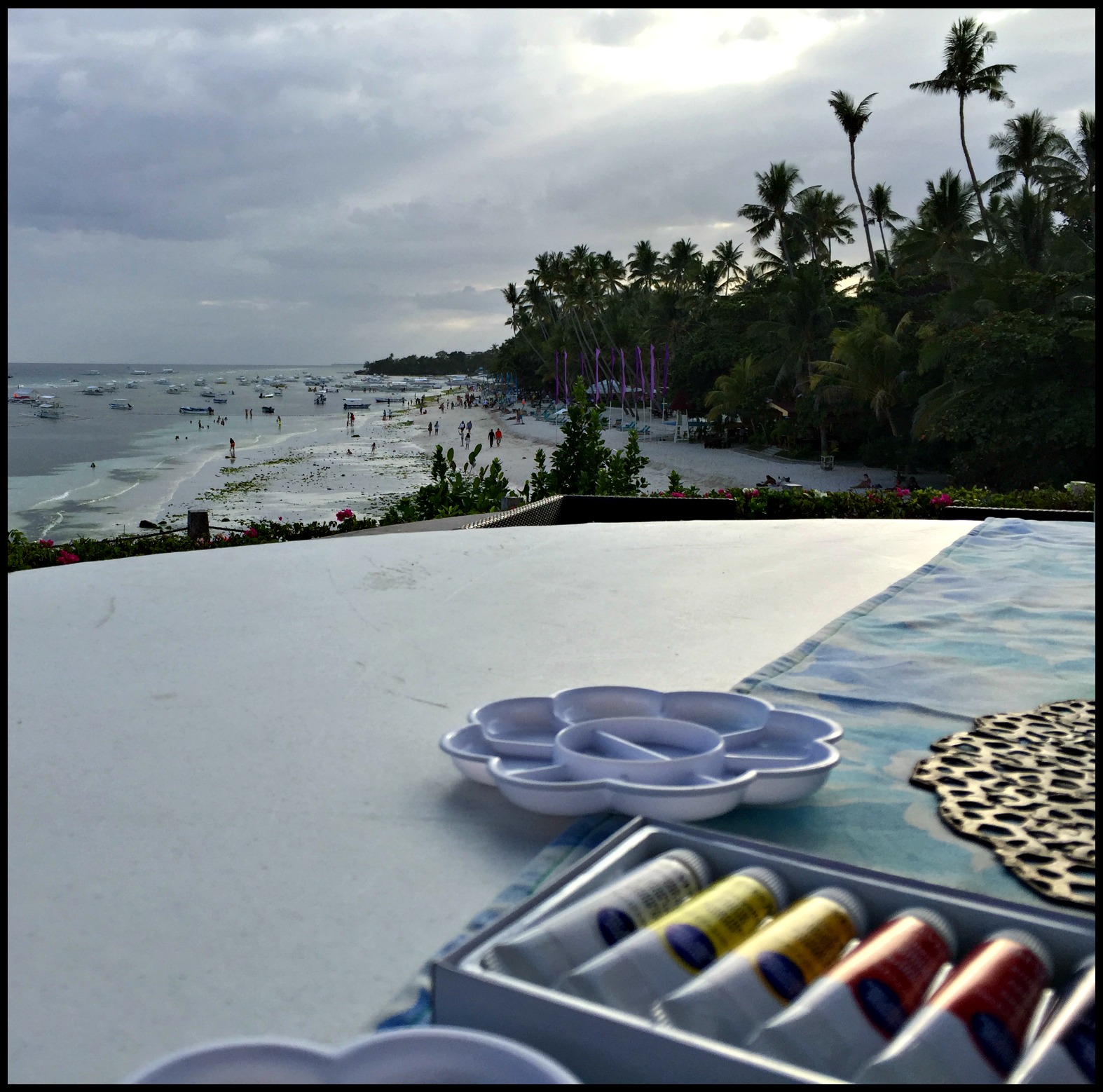 It was here, at dusk that I found myself standing atop the cliff face overlooking the ocean, contemplating why I was here. The humidity hung in the air like a thick curtain and the breeze was gentle and warm. I was at the viewing deck at Amorita, a place where you can sit with a drink in hand and watch the sunset end your day. I looked across Alona Beach, across the ocean and watched the colours move across the sky in harmony. Reflections on the water like a mirror. A painting workshop, water colour, was on offer, and my curiosity beckoned. I sat chatting with new friends, enjoying a glass of wine as we tried to capture the beauty of the landscape on our paper. The worries of daily life dissolved into the watery soup on our page.