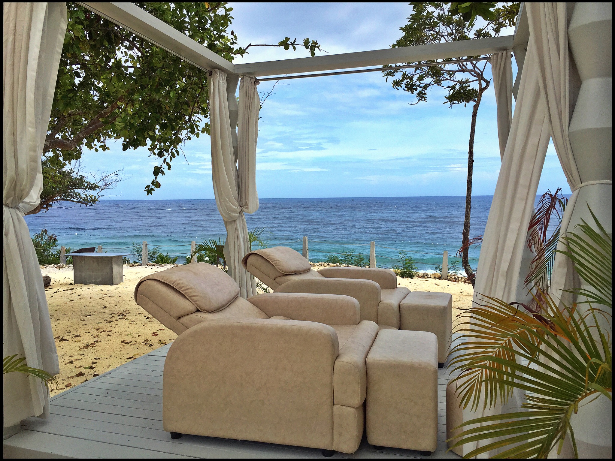 After I had settled in I headed back out to explore, to see what else this resort had to offer. I walked, following pathways that promised to reveal secrets, and they did. I found a secluded cove down in the corner. Past the hammocks and the massage gazebo with billowing curtains perched atop the cliff face, a discreet staircase was built into the rugged wall. Down I walked carefully navigating the rickety wooden structure, holding onto the jutting limestone for support. The sand was so soft and as I stepped down hundreds of little sea critters in their shells scattered. I walked along the jutting rocks and the sand and took photos of old fishing boats sitting on high ground. It felt like this was a graveyard for them. These old girls had done their time and were left here to rest, to gradually become part of the ocean they worked with for so long.