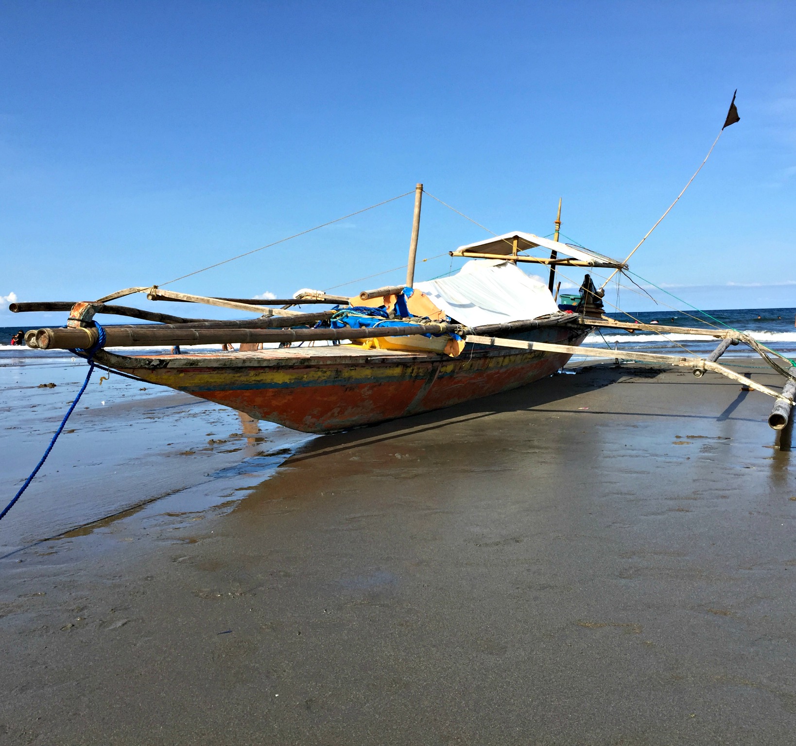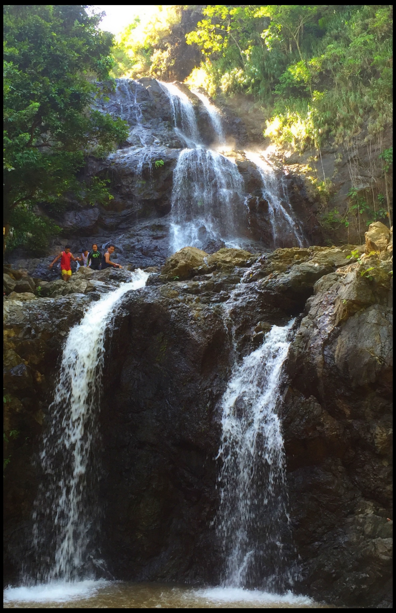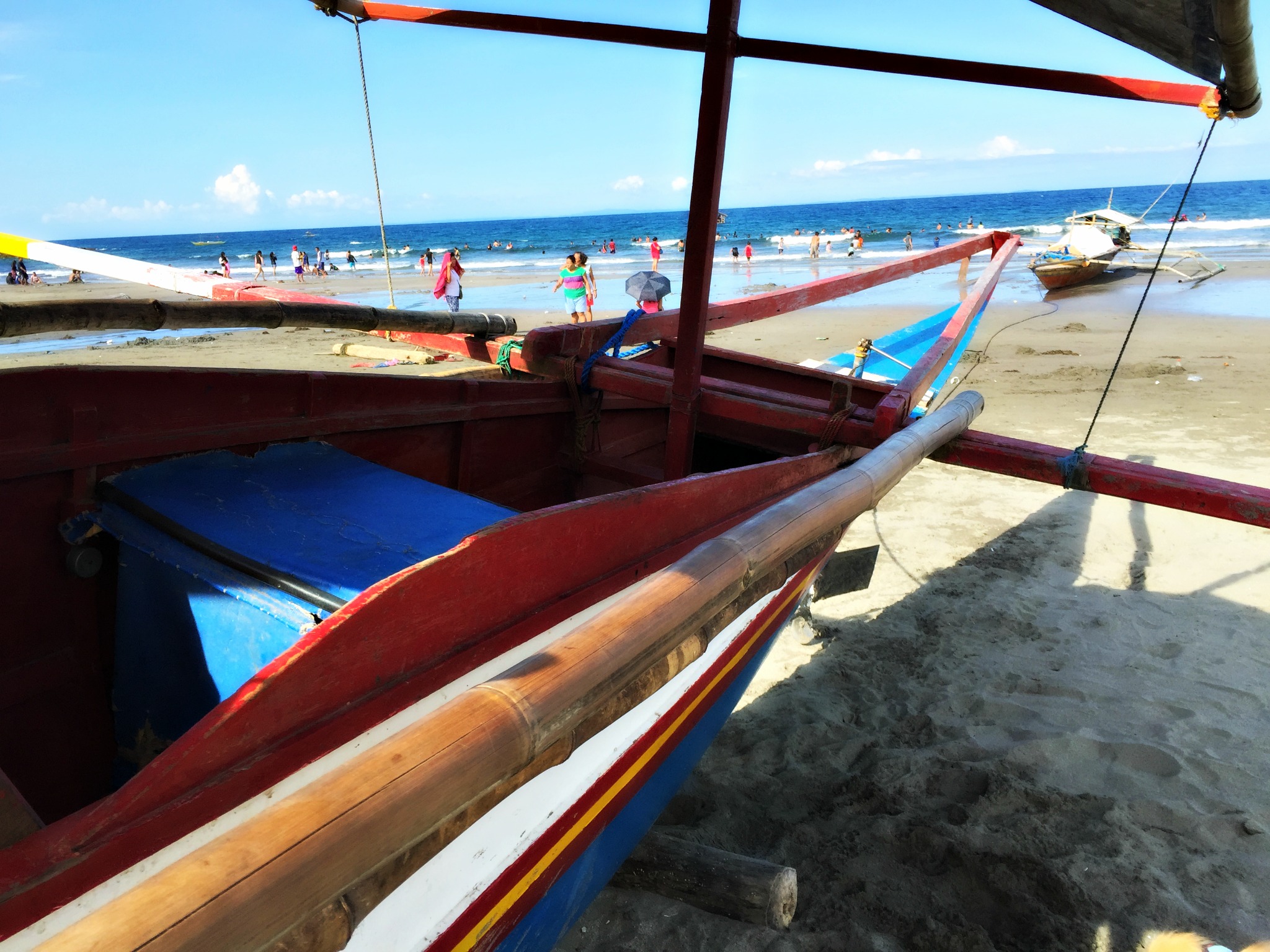 On the way we stopped in at Balabag Falls. Nestled into the mountain, a small fee, then a short walk along a mossy pathway brings you to this gorgeous pool with a giant three tiered fall. This is a local spot for swimming and picnicking and it was busy today. Bamboo cabanas spilled over with visitors and the smell of local’s cooking their BBQ’s wafted through the air. Locals were jumping from the top of the falls into the pool below, with cheers from spectators. Noodles thought he had found paradise as he sniffed around. We had a quick look and decided to keep moving on as it was very busy. We also really wanted to find the Pacific Ocean. We wanted to have our feet in the water and wriggle our toes in the sand.