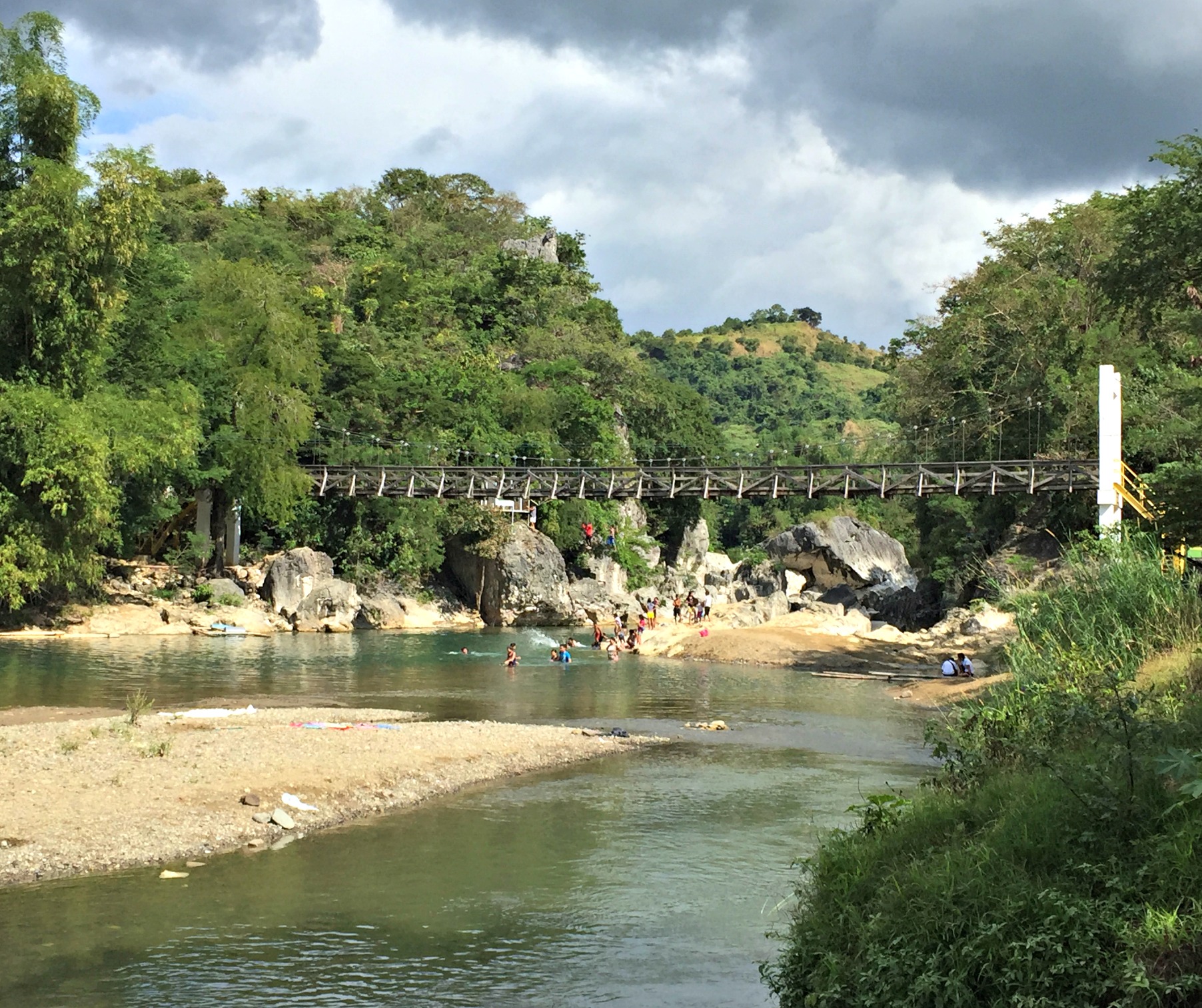 The decision to visit the national park was a last minute one. We hastily threw together a picnic, grabbed our bathers, a few towels and water bottles as we ran out the door to beat the traffic. The drive out to Biak Na Bato took about three hours. If you follow Waze you should find it without any problem, except for that one direction that took us down a dead-end road, although SB said I did not know how to follow Waze to which I answered that Waze ought to *&$%#@! Our driver clicked his tongue and shook his head at me. However, we got there in the end and on arrival to the car park we saw a big flowing river and a tall bridge to walk across. Locals were washing their clothes downstream and children swam near the bridge, using it as a jump-off point. It looked pretty awesome.