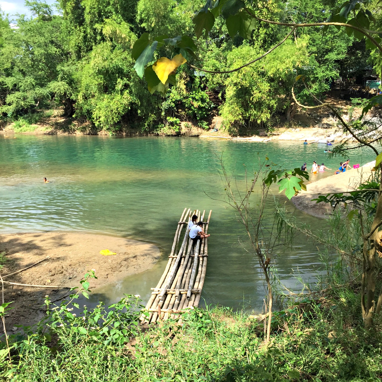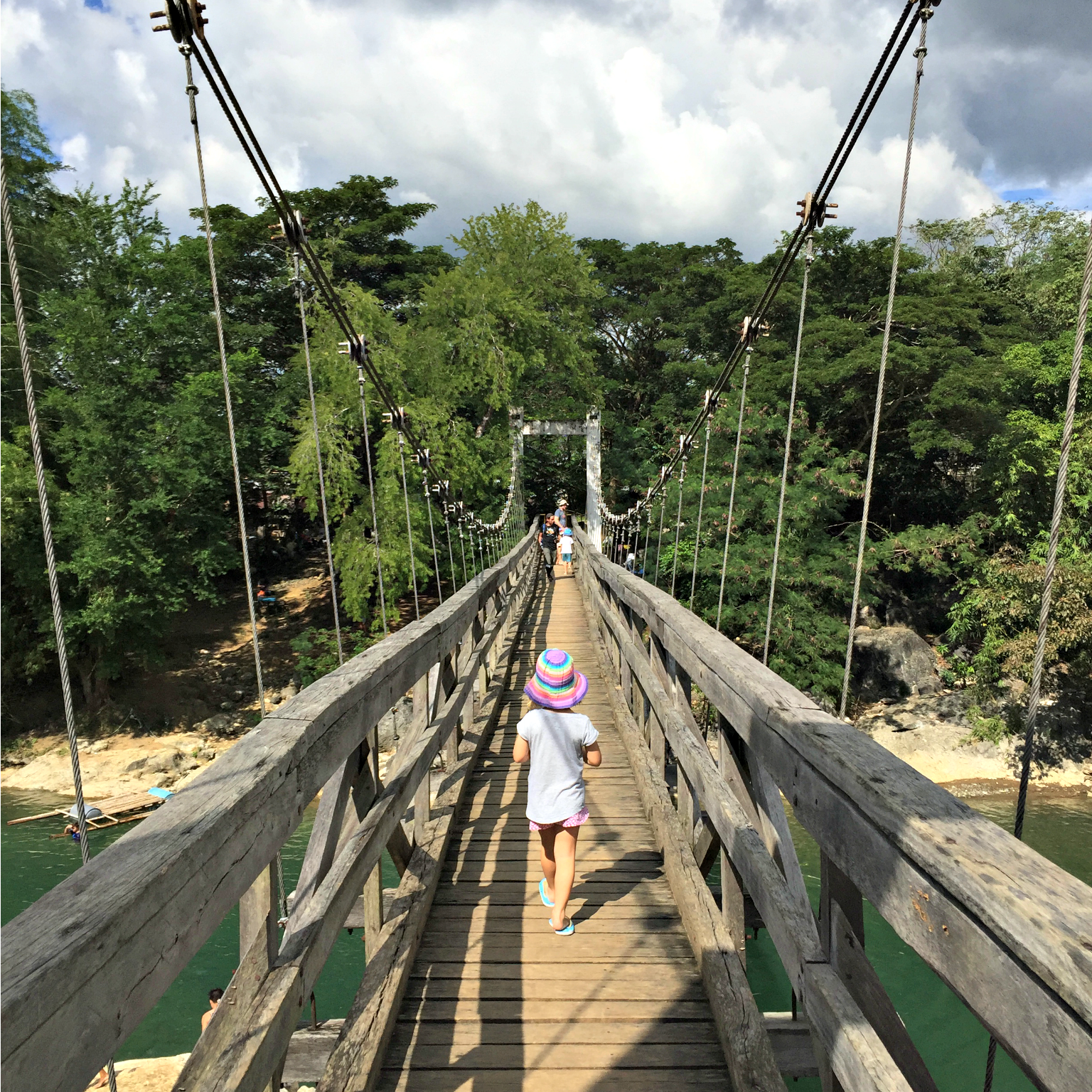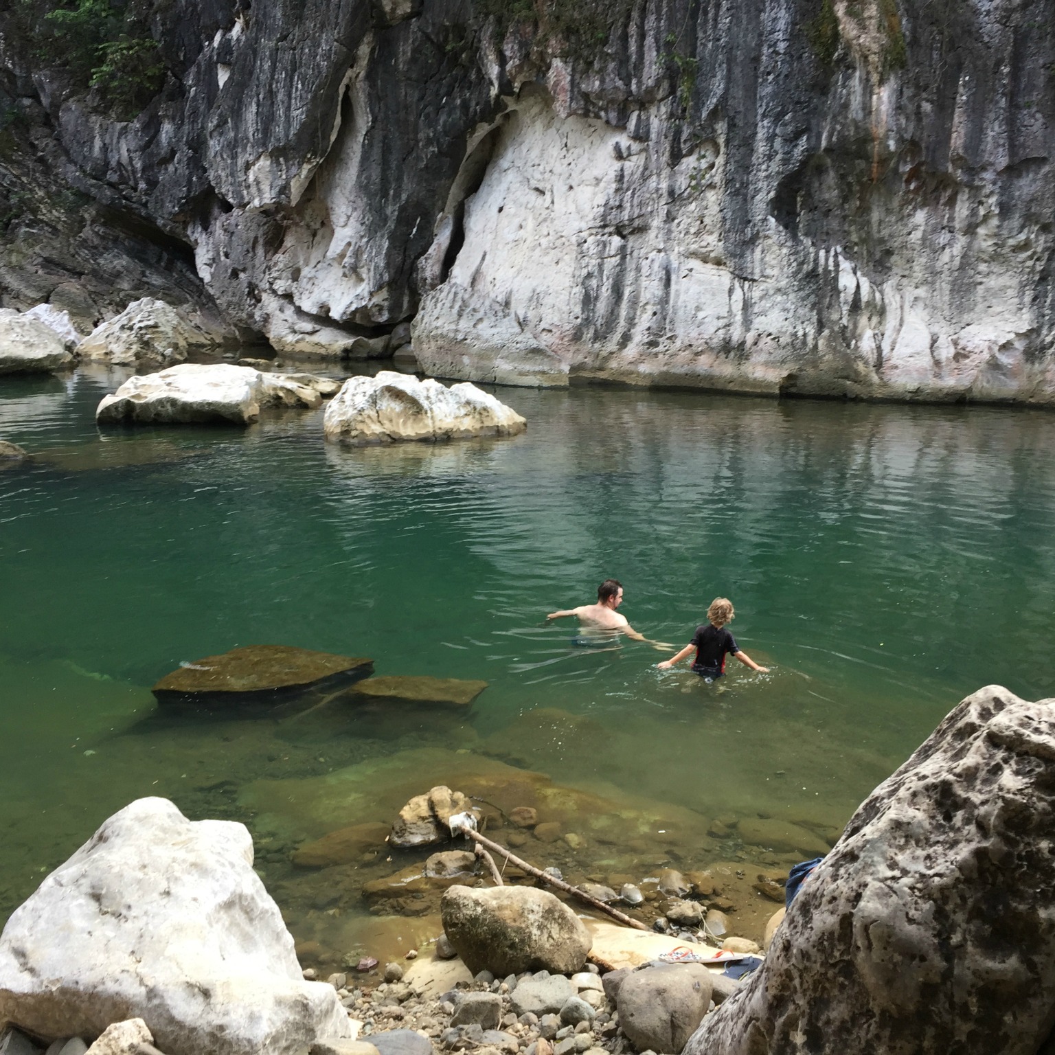 We walked across the large bridge, politely turning down offers to hang by a wire and tightrope across the rapids – for fun… and found a picnic area where the guides were hanging out. We did not want a guide, nor to hang out in that area so instead walked off to one side and climbed over some rocks until we found an area near a deep pool where we could stay for a while.