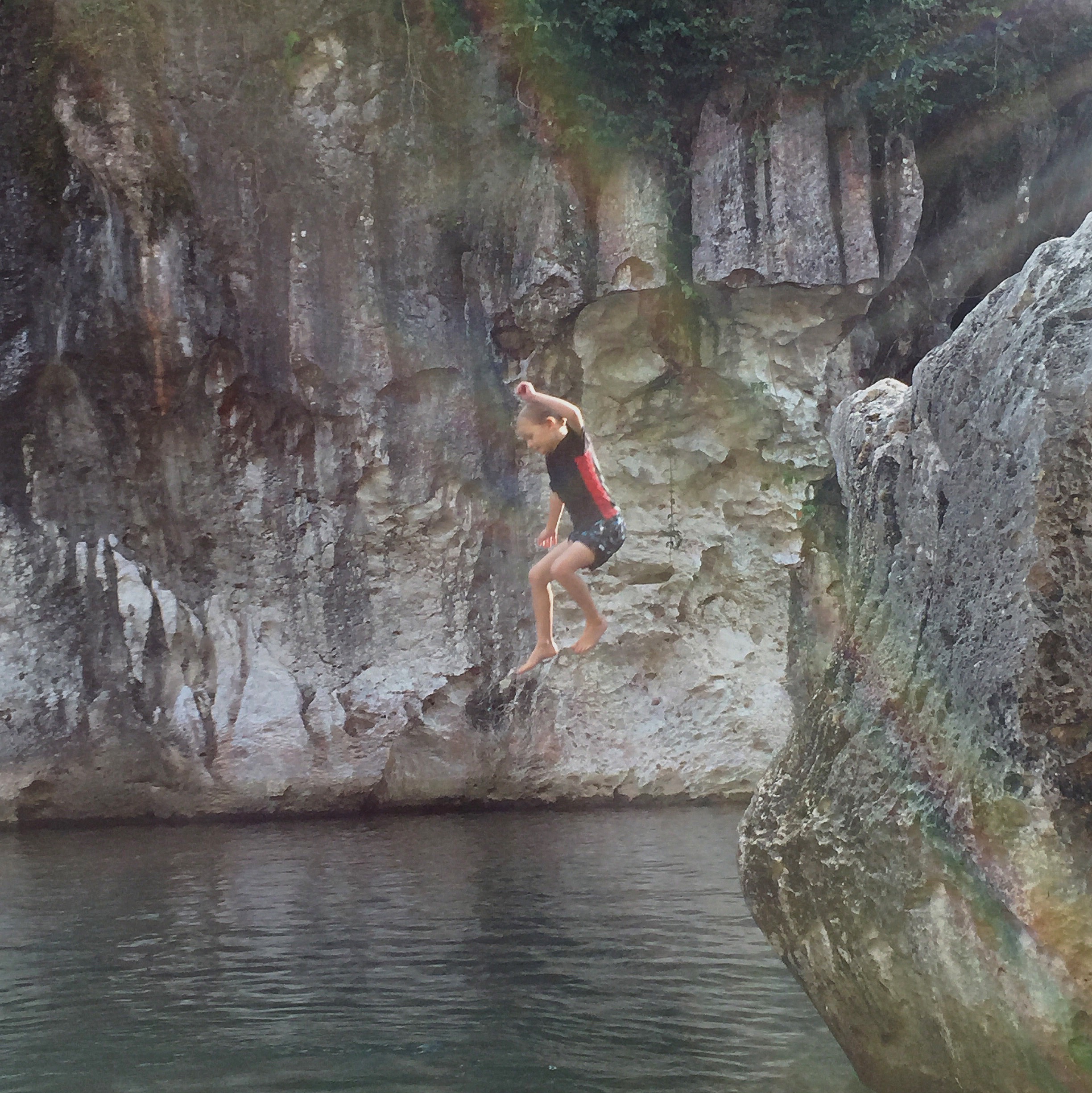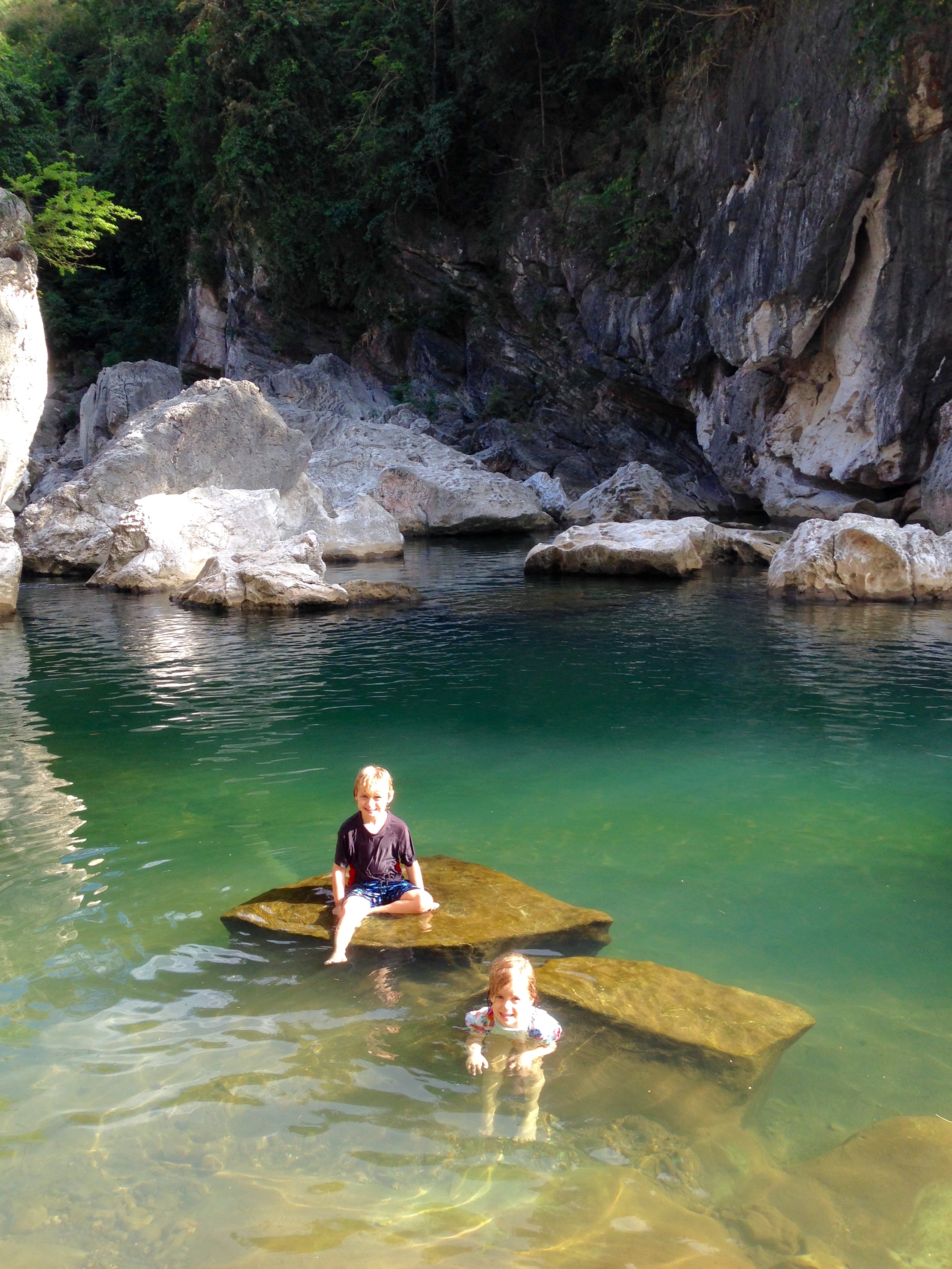 Two young local boys were hanging around in the water, watching us with curiosity. They climbed up a tall boulder and took turns jumping off into the deep. BB watched with wide eyes and looked at me longingly. ‘I want to do that’ he said and reluctantly I agreed. The water was really deep, too deep to stand at the landing point and so without language between them, the local boys showed BB how to climb up the boulder, and how to jump off. After the first jump, BB was hooked and my heart was pounding, as only a mother’s can. Over and over he climbed up and jumped off, taking turns with his new friends. SB gave it a go too. Little FB said she wanted to do it and SB and I in unison said ‘NO! One day when you are a bit bigger…’ ‘Hey! Let’s be mermaids instead’ I said to distract her from the unfairness of life as a four-year-old.