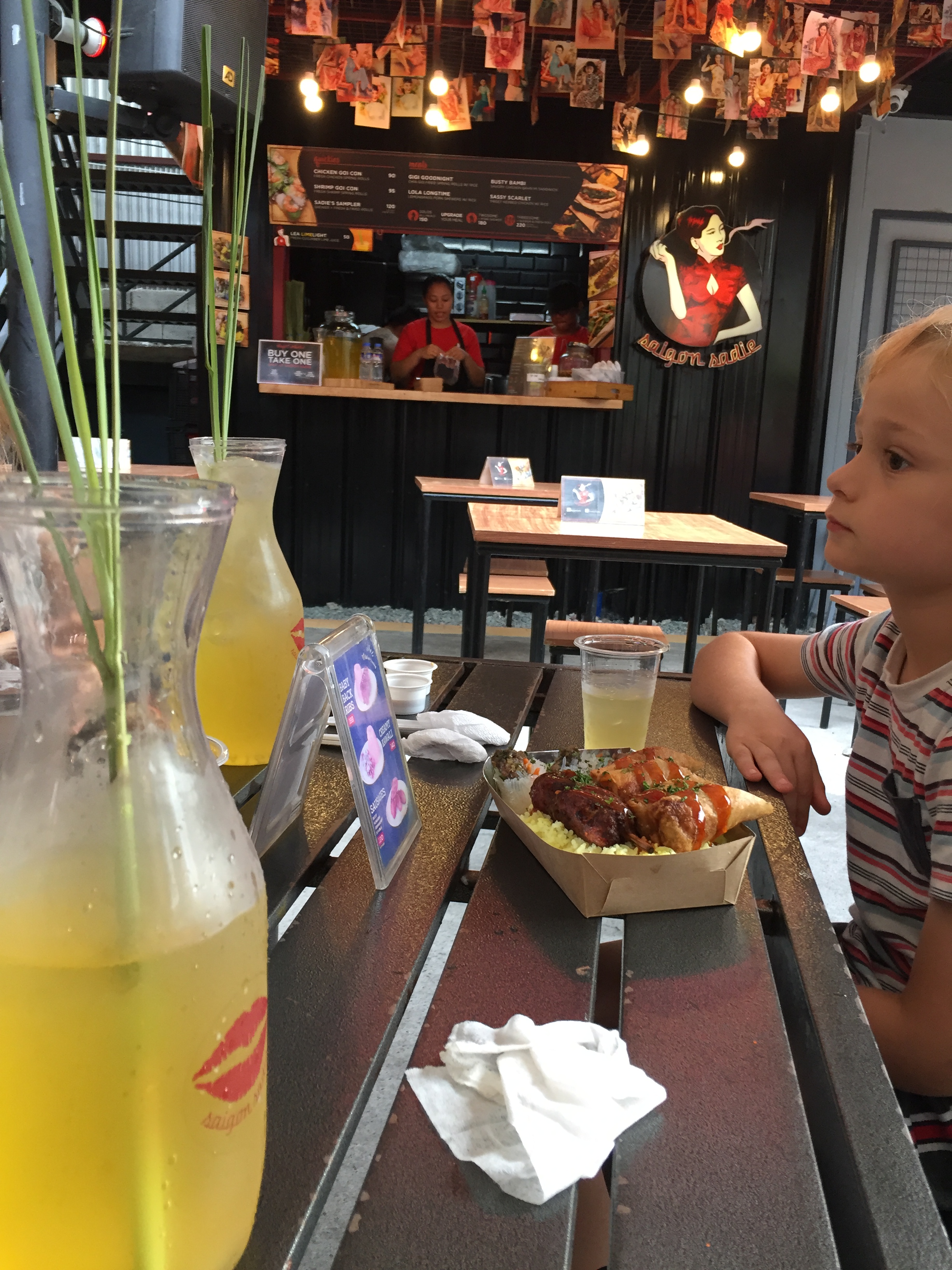 Opened from 4pm until midnight, The Yard Underground has around thirty stores offering a range of food choices. There is a bar called The Chemist where you can get cold beer and cocktails. We started our evening with a gin and tonic as we sat back and took in the atmosphere. When we arrived it was relatively quiet but quickly became busy as the crowds filled the space. I walked around asking revellers where they got various fancy looking drinks and meals from. I was quite awestruck by the artisan milkshakes and juices on offer. Â Our first meal was from Saigon Sadie, a plate called Gigi Goodnight. Fried pork rolls with skewers and chicken spring rolls, served with buttery rice. Â It was tasty and an easy plate to share with the family. We decided to move upstairs and try to find somewhere cooler to sit, as it was really hot.