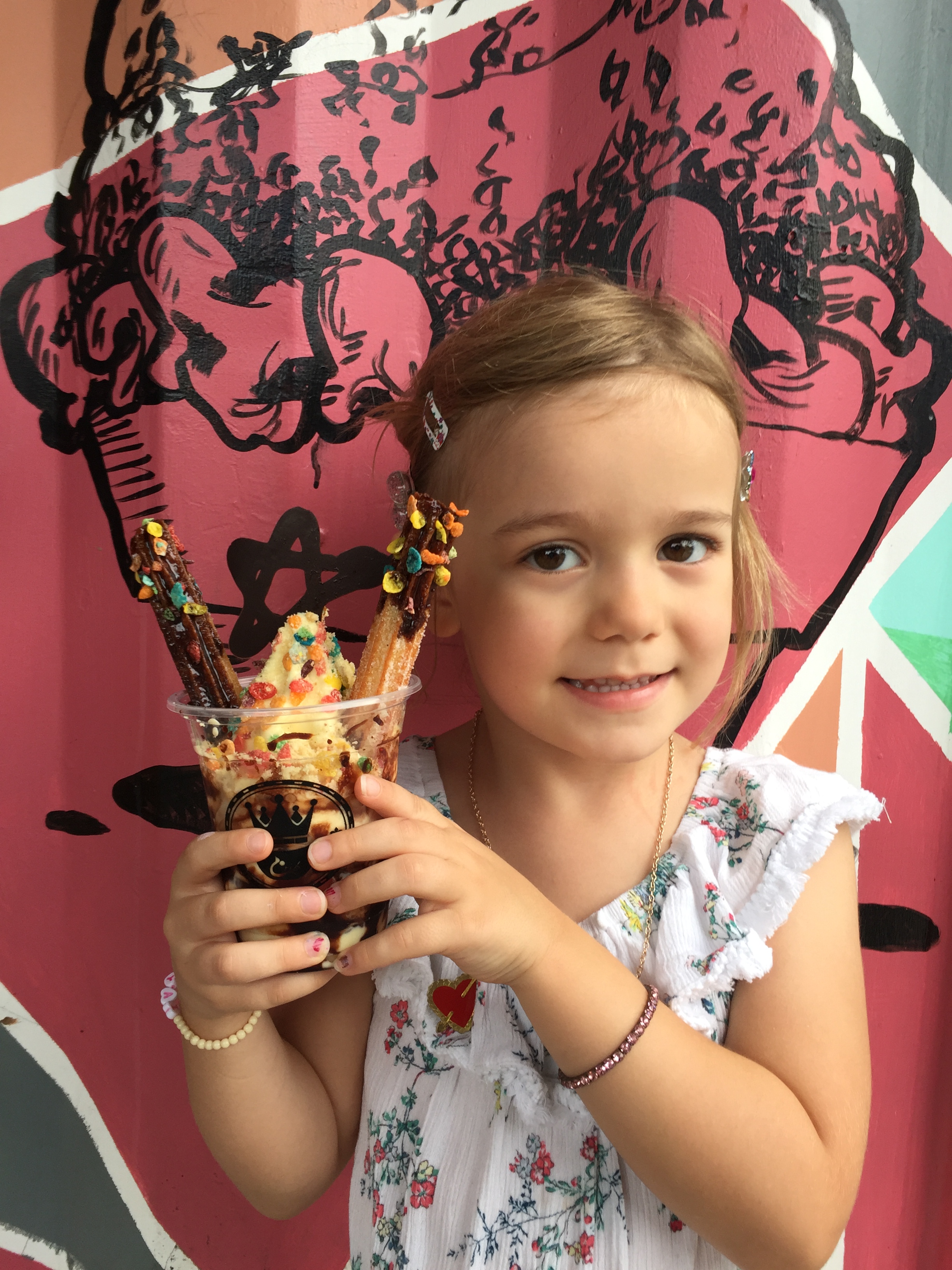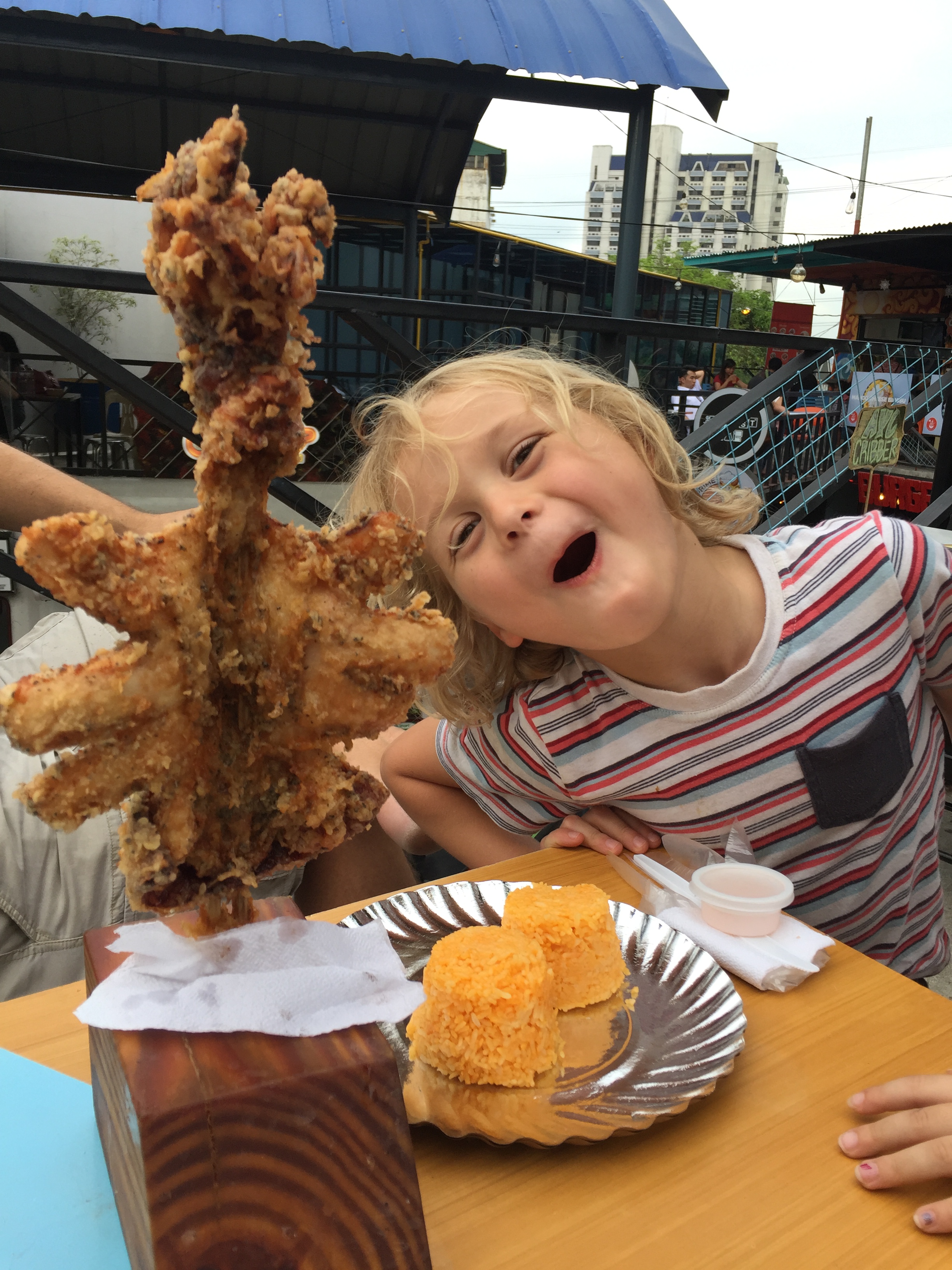 Our next meal came from Above Sea Level, a place that only sells butterflied squid. It looks quite the event when it is presented to you flayed on a skewer, with plastic gloves for you to wear as you tear it apart. Look, this is not really my thing, but the boys like squid so I thought they might like to try it. The flavour is really strong, with heavy seasoning in the batter, so it is not to everyone’s taste and they did not finish eating is. While the boys were figuring out how to eat their squid, I went next door to Amo Yamie Crib and brought a fairy-tale themed icecream for FB and I to share. I have to say that was the highlight (when is it not?). The icecream was thick and creamy and in the bottom of the cup, little liquid filled bubbles that popped in your mouth created a bit of a party atmosphere.