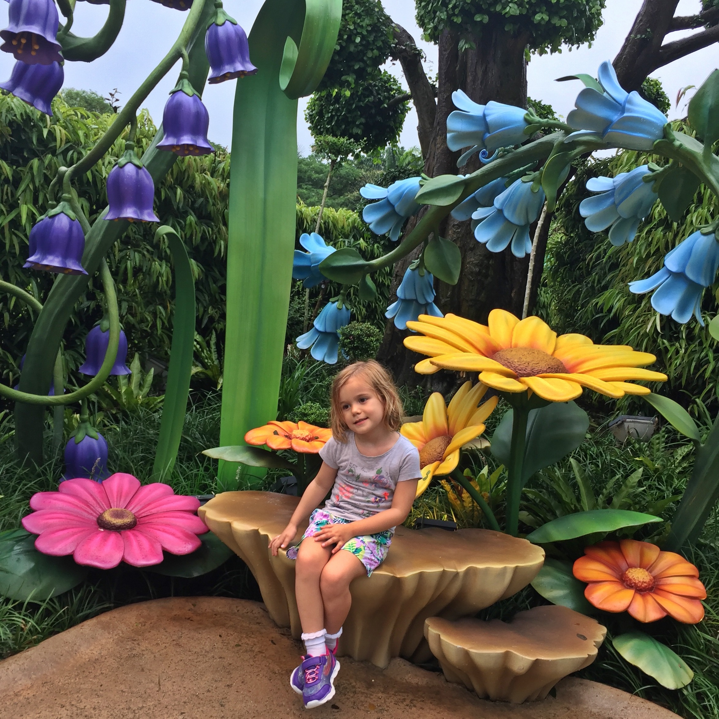 That night after dinner we took a stroll through the four themed gardens at the Disney Explorers Lodge. The gardens are named after characters from movies and are the Kevin Garden which is South American (I don’t know – SB reckons that is from Up), Little Squirt Garden (Finding Nemo) which was by far the kids favourite, the Hathi Jr. Garden (Jungle Book) for Asia and the Rafiki Garden (Lion King) which was an African Savannah. They are so well done with themed music playing through speakers as you wander through for a truly sensory experience. The kids had a wonderful time running barefoot on soft grass. They ran up grassy banks and rolled down again. It was a lovely end to our first day with giggles filling the air. The temperature was warm and balmy and soothing to our weary souls. I felt calm, relaxed – happy. I was excited by the adventure that awaited us.