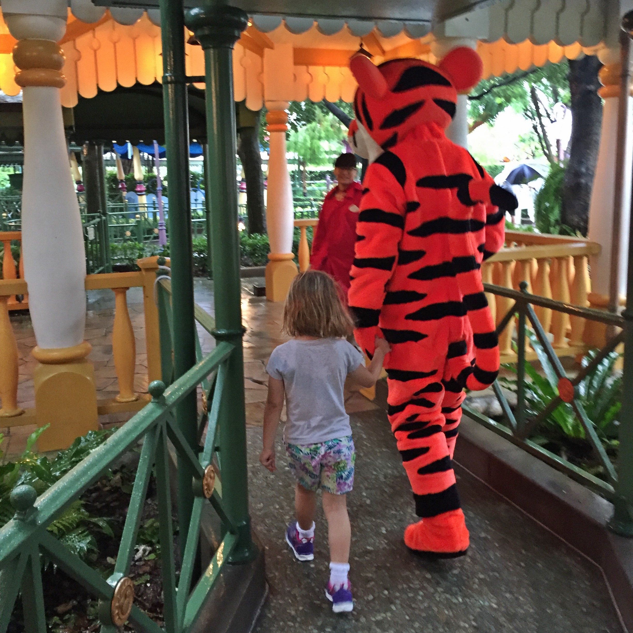 We walked back to our resort – just next door. That was when it started to rain. We legged it up the driveway to save Rapunzel’s wig turning into a fur-ball.  FB got changed and it was out the door to Disneyland.