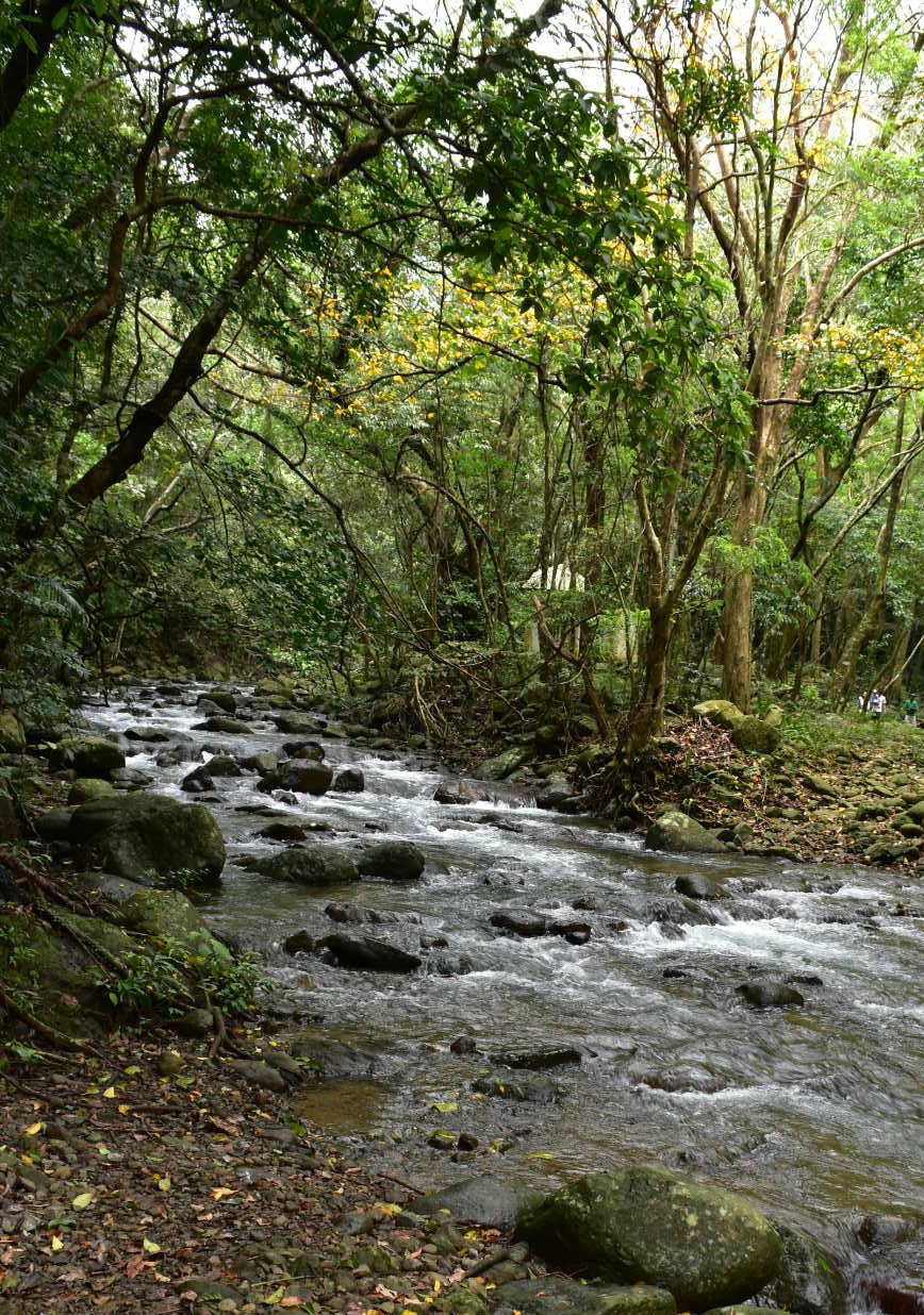 The more we walked the more the landscape opened out and changed. Beautiful deep green rice fields, surrounded by dense majestic cloud-tipped mountains simply took our breath away. Small wooden huts sprinkled around and the trickling mountain brook sang by our side along the way. Closer to the falls the landscape changed again as we walked into the mountains. Now, it felt like I was at home, in the Sterling Ranges. Damp leaf litter under our feet and moss covered rocks lined the pathway. The forest was thick and large canopies of leaves protected us from the beating sun above. The songs of tropical birds called out through the leaves and the breeze danced through the trees, making them sway. The music of the stream changed, it was softer, diffused by nature and putting the finishing touches on an incredibly idyllic walk. We would stop and look at local trees with plaques telling us what they were, and run our hands down their trunks, feeling their texture. Our guide Ruby told us how this was all virgin forest, no one is allowed to live here and they have a program to plant 19-20 thousand seedlings a year. And I wondered why the rest of this country aren’t on board with conservation if these people have it so right.