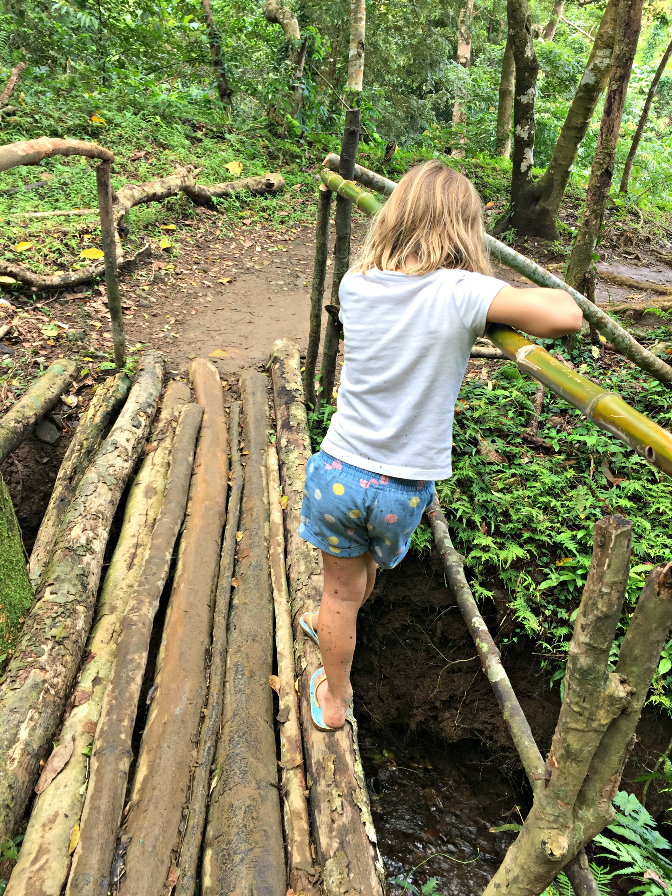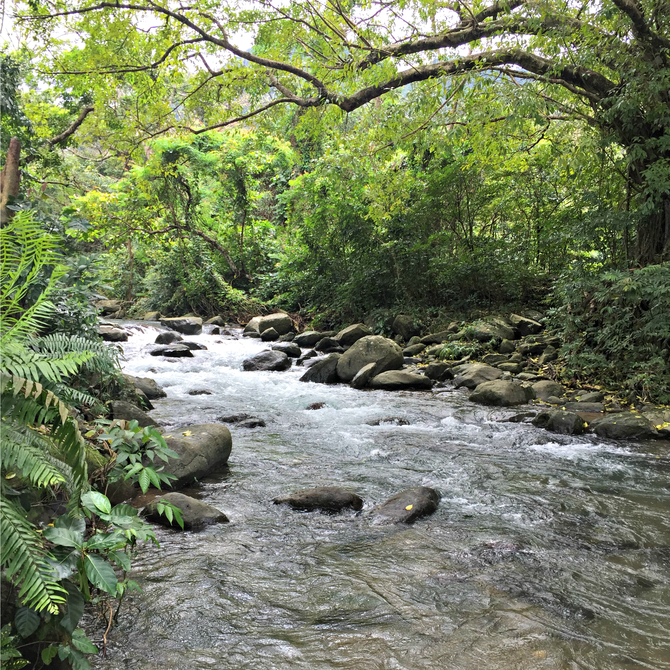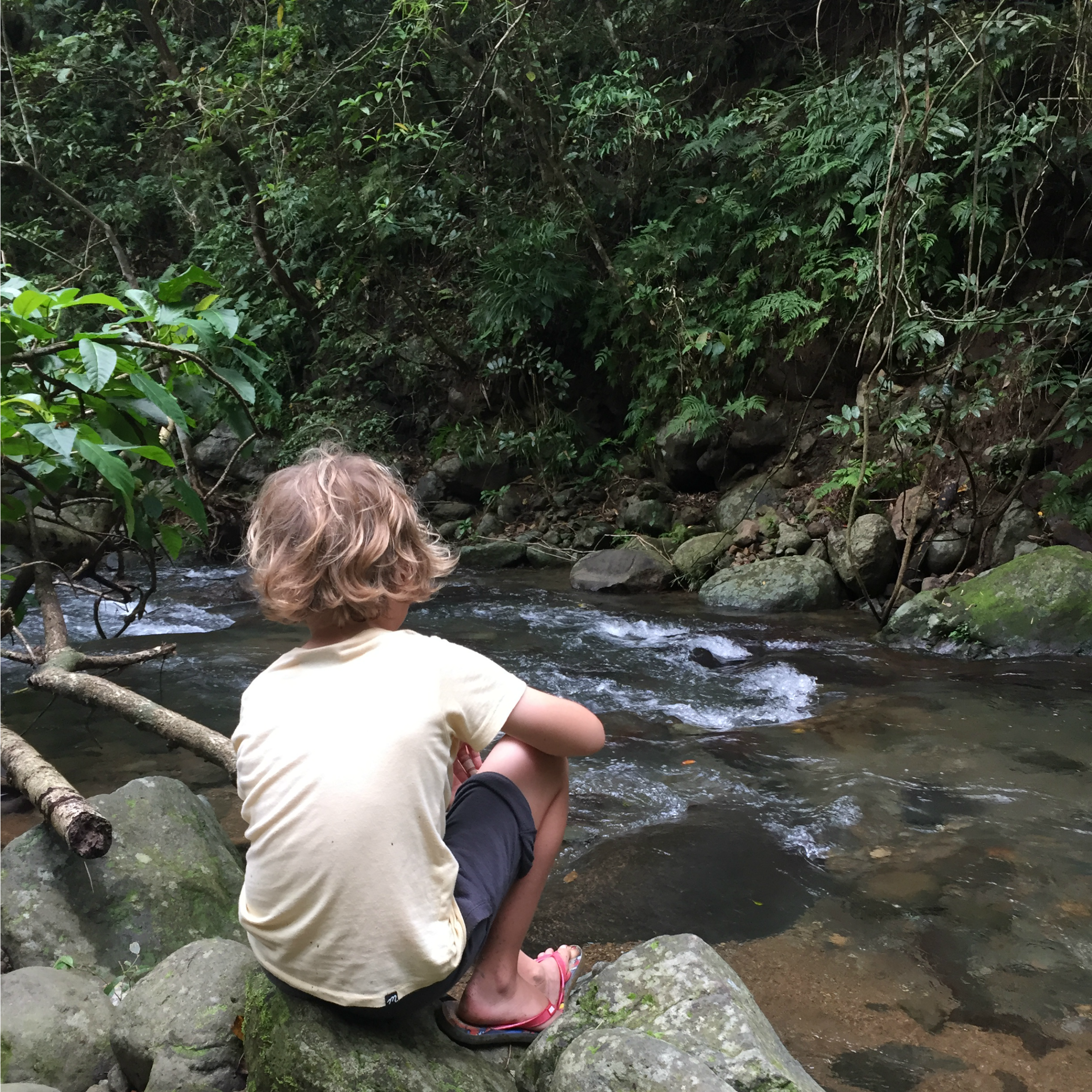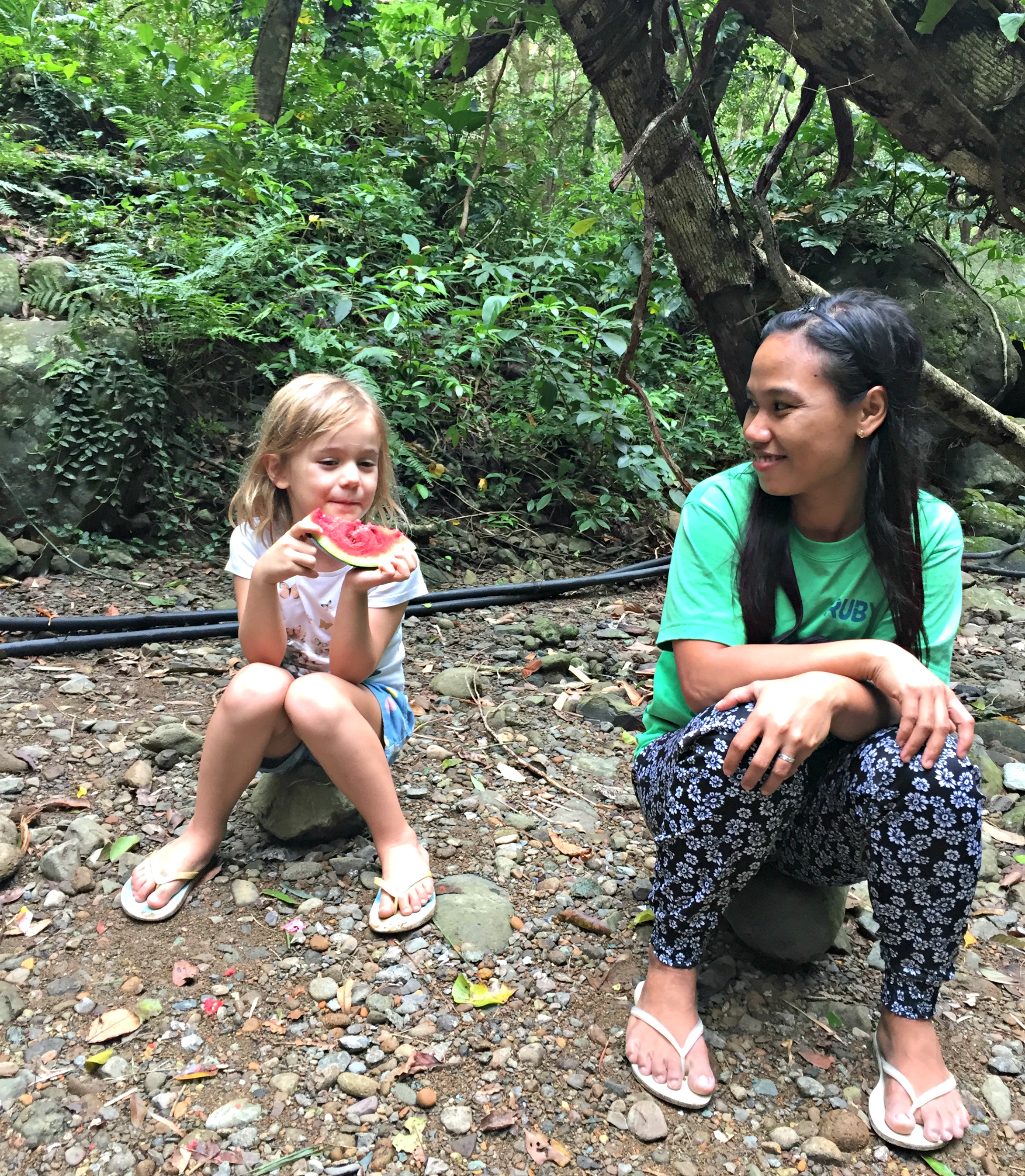 We walked down a way heading back and decided to take a rest. The children needed a snack and we were not quite ready to leave this tranquil, beautiful place. SB wandered through some trees and found a secret space by the trickling mountains stream. Surrounded by trees, the water was cold and crisp. We dipped our feet into it, washed our hands and splashed it onto our necks and faces. SB had brought a watermelon from a market and carries his Bolo Bolo whenever we are adventuring. He cut big juicy slices for us to eat. Sitting in the shade, we chatted with our guide as we slurped and spat out the seeds.