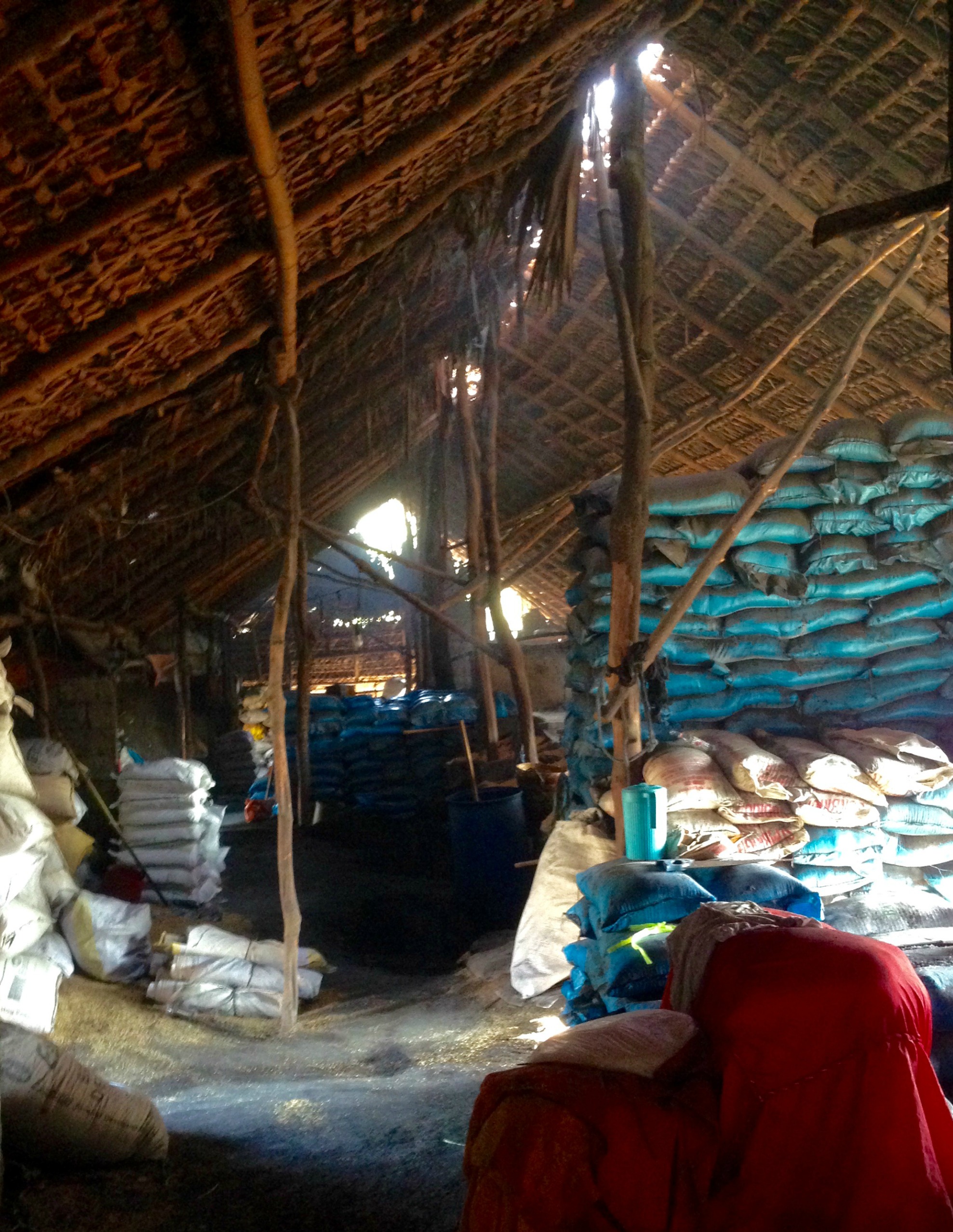 The room was dark, the wall on the opposite side to the entrance was open space, so as to let the smoke and fumes out. Bamboo frames and overhanging nipa provided shelter from the elements and the sunshine streamed in through the smoke, creating a glow that added to this other-worldly setting. There was a large pile of sacks, filled to bursting and then a long row of large shallow baths lay in front of the open wall. Filled with water that was bubbling gently, smoke streamed off them, making the sunlight glisten through smoke curls, and it looked beautiful. Rice husk was piled high in front of each bath, almost hiding the fire pits below and a young man was walking up and down pushing a little more husk down into the fire pits, bit by bit using a long stick with a small rake on the end.