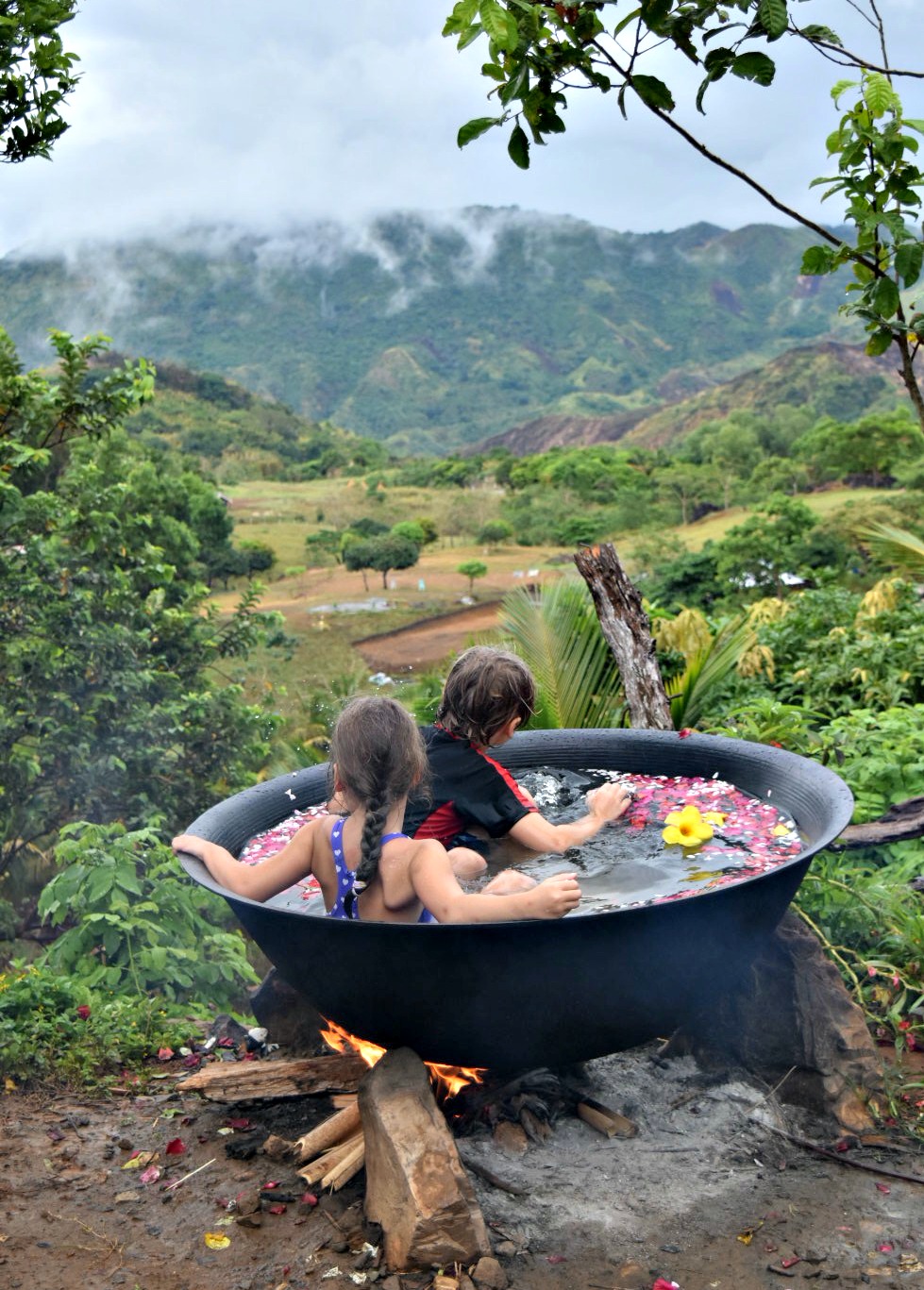 We packed up a picnic and left early at 7am. The traffic was amazing and we arrived by 9.30am. As we arrived it started to rain. ‘It’s okay, it will pass’ I said…and it didn’t until right before we left. However, that didn’t take away the fun of the place, it just made it a little more muddy, so with beach towels over our heads we watched as the baths were filled up and the fires lit. The smell of smoke filled the air and it reminded us of home, of camping, of bushfires. Flower petals floated around with the movement of the water and the children ran around excitedly as they waited to climb in. The view across the Sierra Madre Mountain Ranges is gorgeous, and we just stared at it, listening to the distant thunder rumble, and watching the clouds move with the winds, changing shape, gradually revealing what lay hidden behind them. If you have not been out into Tanay, you really are missing out.
