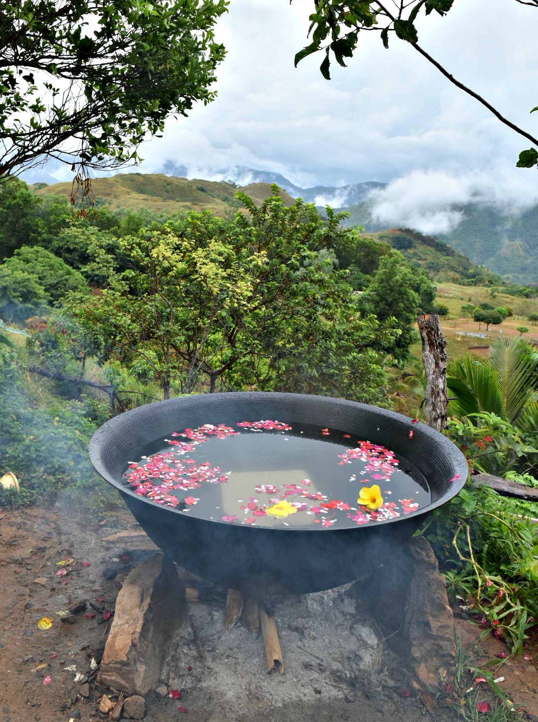 There is something alluring about being slowly boiled in a large bowl over open flame, staring out at mountains and being dressed in tiny flowers (that’s the seasoning).