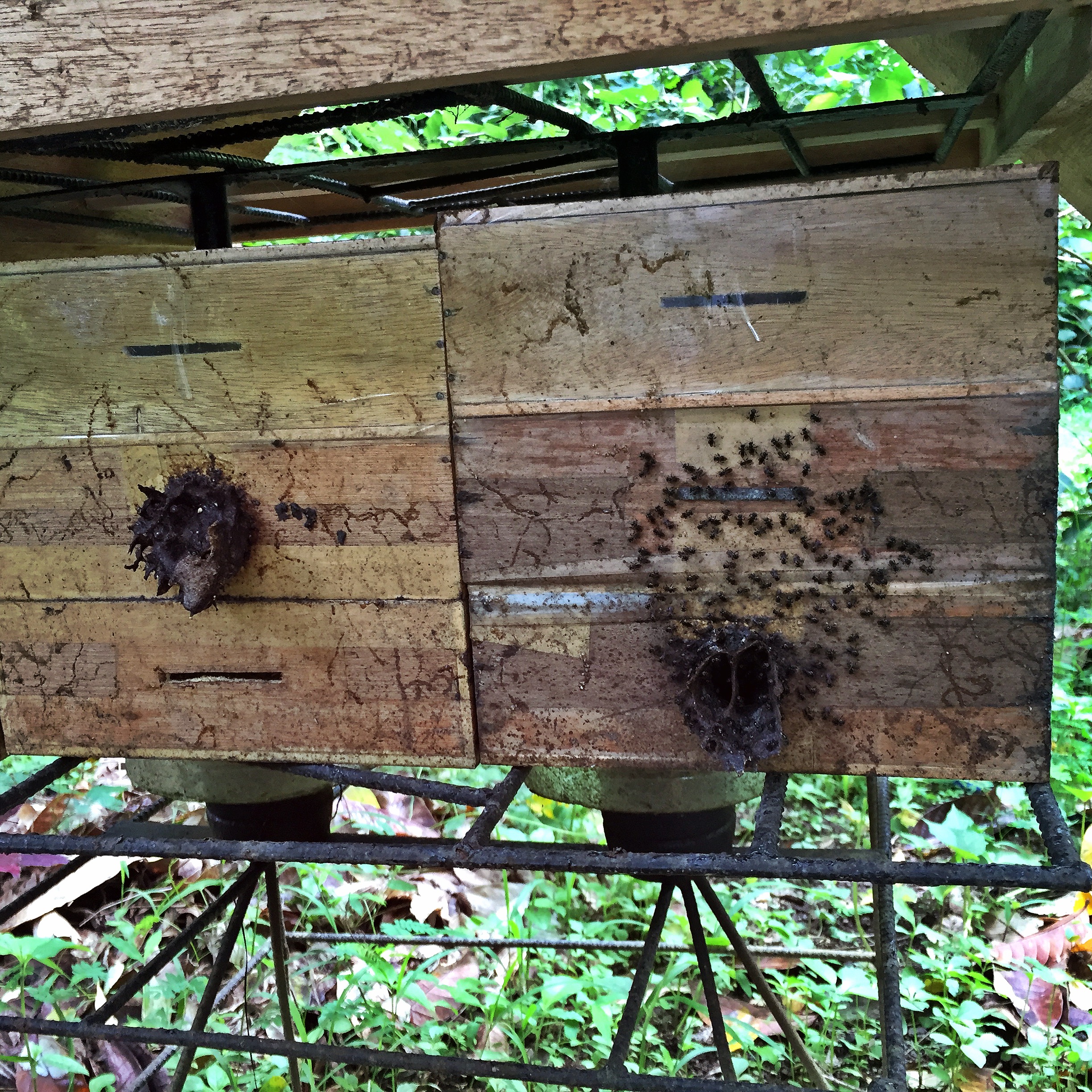 We were introduced to the Stingless Bees. Now, these bees are tiny, they are native to The Philippines and you would be forgiven for thinking they were very annoying blow flies. They build their hives with the resin from trees which is sticky, and that is what they line the entrance with to stop crawling insects coming in and attacking them. When you see the inside of their hive you kind of get creeped out. You would be forgiven for thinking it was from some sort of science fiction film, and in fact, I have no doubt at all that these hives have inspired many a horror/sci-fi film over the years. What can I say? There are sacks that hold the honey and then little eggs and everything is stuck together with resin vines that look like alien sputum.