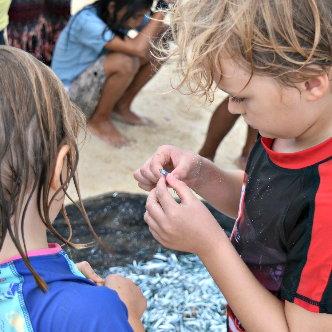 That afternoon we took a small boat out to a nearby sandbar, just for a look-see and we got there as local fishermen were pulling in a net filled with tiny shiny silver fish. They sorted through the fish with family members looking on, and FB and BB were excited to find baby cuttlefish they released back into the ocean.