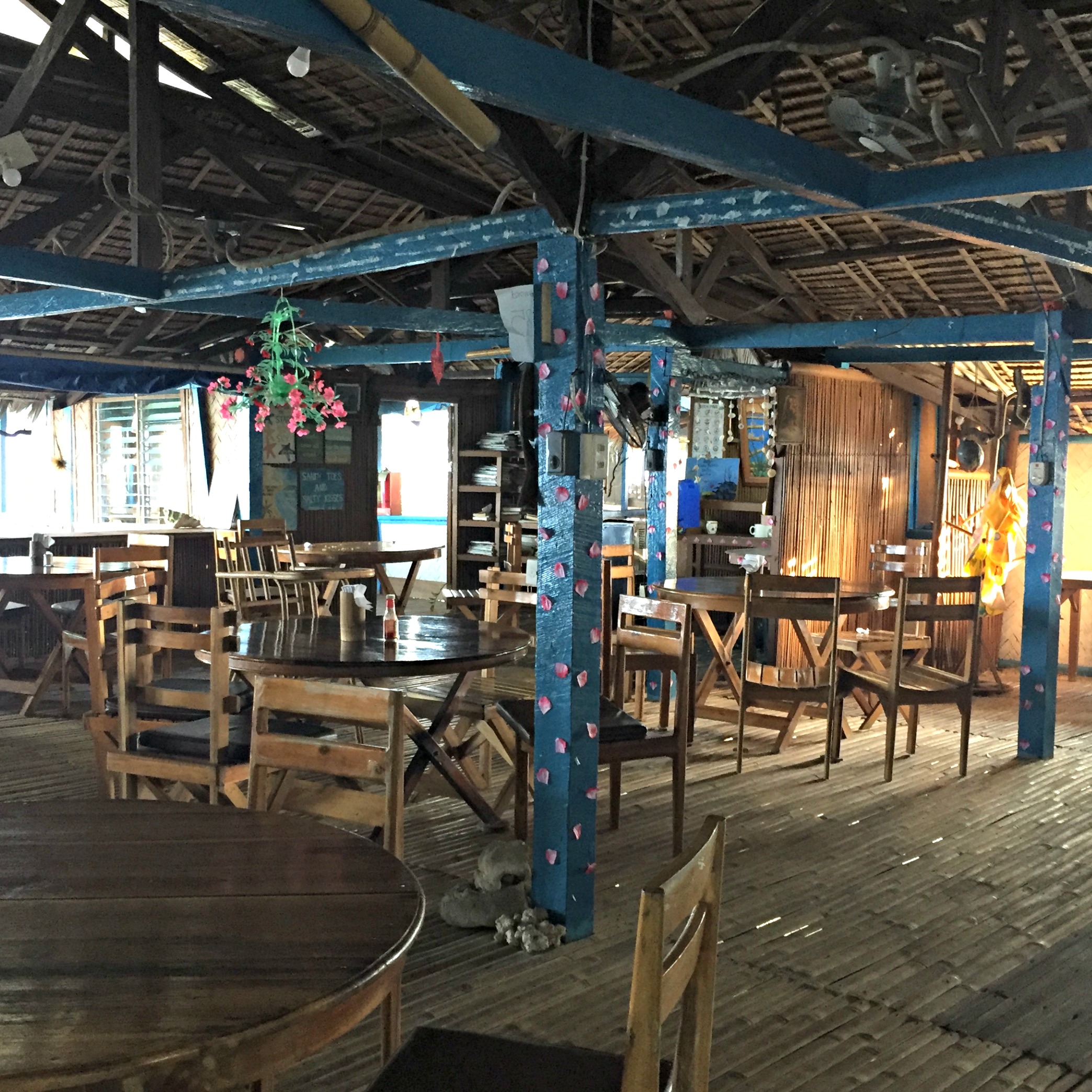 The main building is split level, its various entry and exit points make for an excellent game of discovery. Beach themed quotes line walls, exposed beams have shells hanging off them, and the restaurant floor creaks underfoot as you walk, while the resort dog sleeps off the heat. It feels like something out of a movie. A games room houses a pool table and dart board, outside is a volleyball net. Next door, on the ground floor of a tower is the ping pong table. Climb the stairs to a second and third level where you can sit for hours, staring out at the perfect waters with the mountains of Palawan, pale blue in the distance.