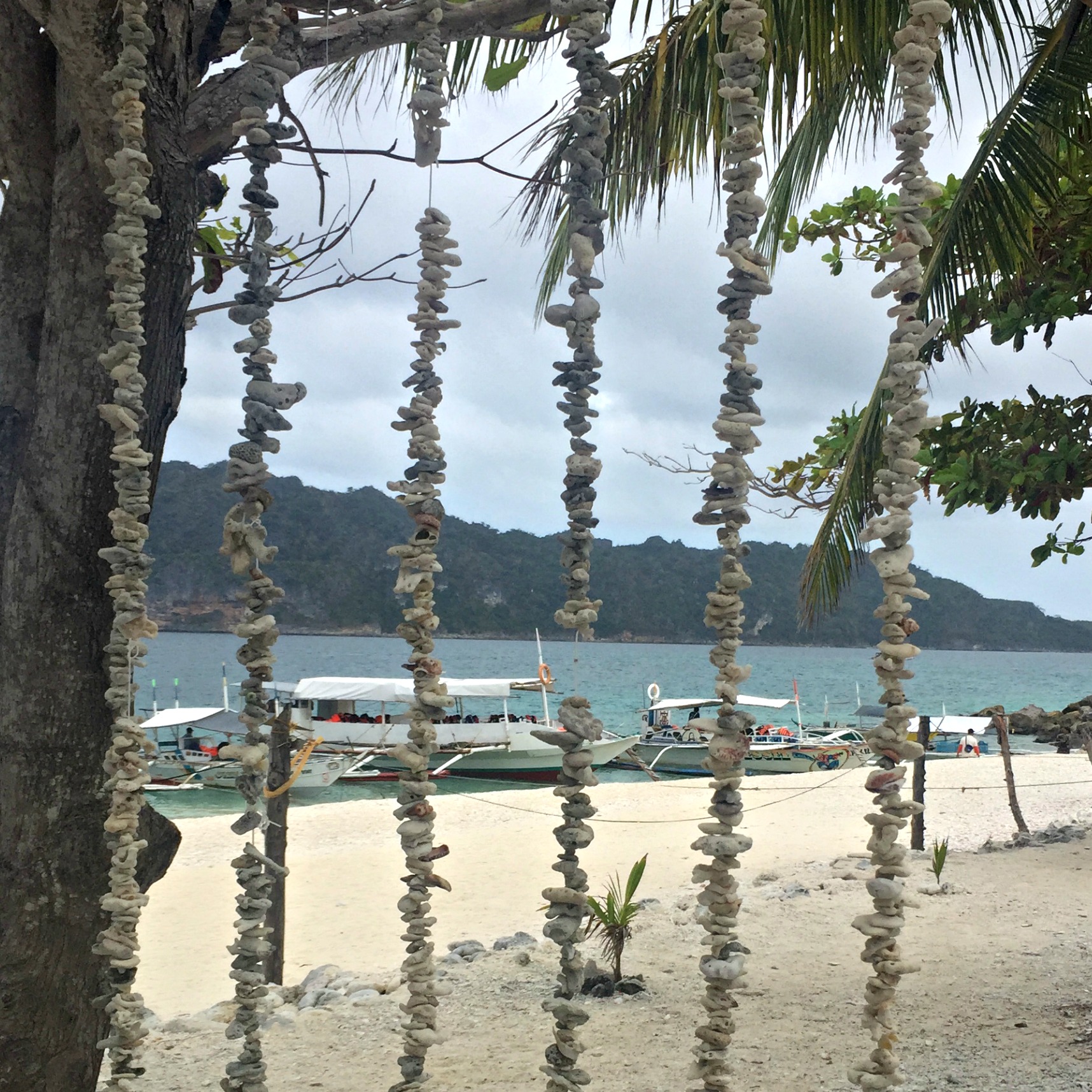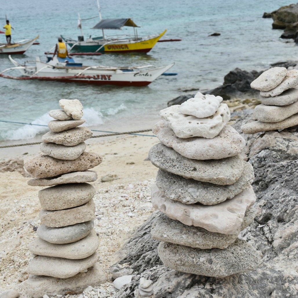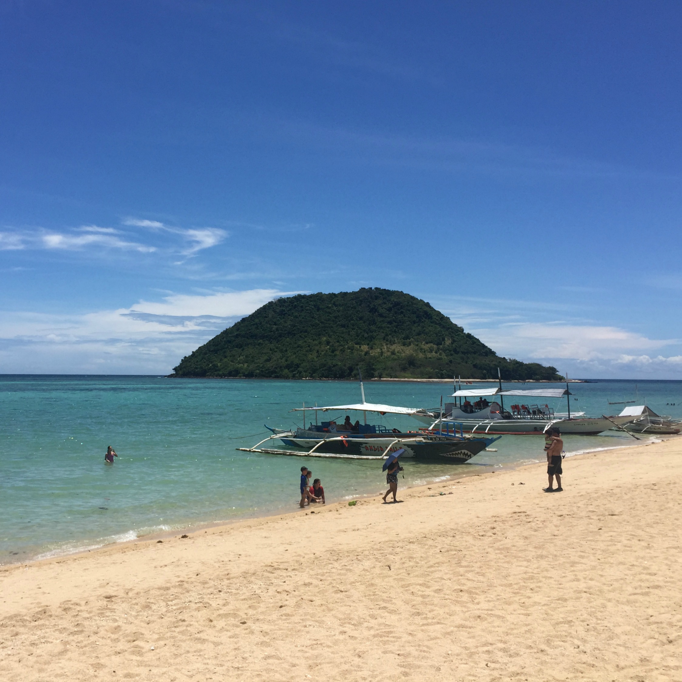Unfortunately it was busy – very busy and really super touristy, being a long weekend and all. In retrospect we would not have done the tour, we would have found something less touristy to focus our time (and money) on (for me staying in bed dying a slow and agonising death was right up there with my choices). However, the first stop was at Cabugao Gamay Island, a sweet little island offering a two-sided beach. The line to climb to the top of a rocky croft to a view deck for a photo op was ridiculous, I mean seriously… Needless to say, we didn’t line up. Personally, I am not interested in photographs with a bunch of strange people in it and I do not queue up unless absolutely necessary. Anyway, we admired the cairns (manmade stone piles) people had created around the place, a nice little touch I thought, and walked up and around the island to an isolated beach area. We sat here for a while enjoying the fresh air. It was too choppy and rough for the kids to swim but SB went snorkelling. He returned pretty quickly having met a shark while out there. A reef shark, but a shark nonetheless. We told our boat captain and he laughed and said ‘there are no sharks here’ to which SB exclaimed ‘umm…yes there are, I just met one…’ and the captain laughed us off and said ‘come on time to go…’ so we did.