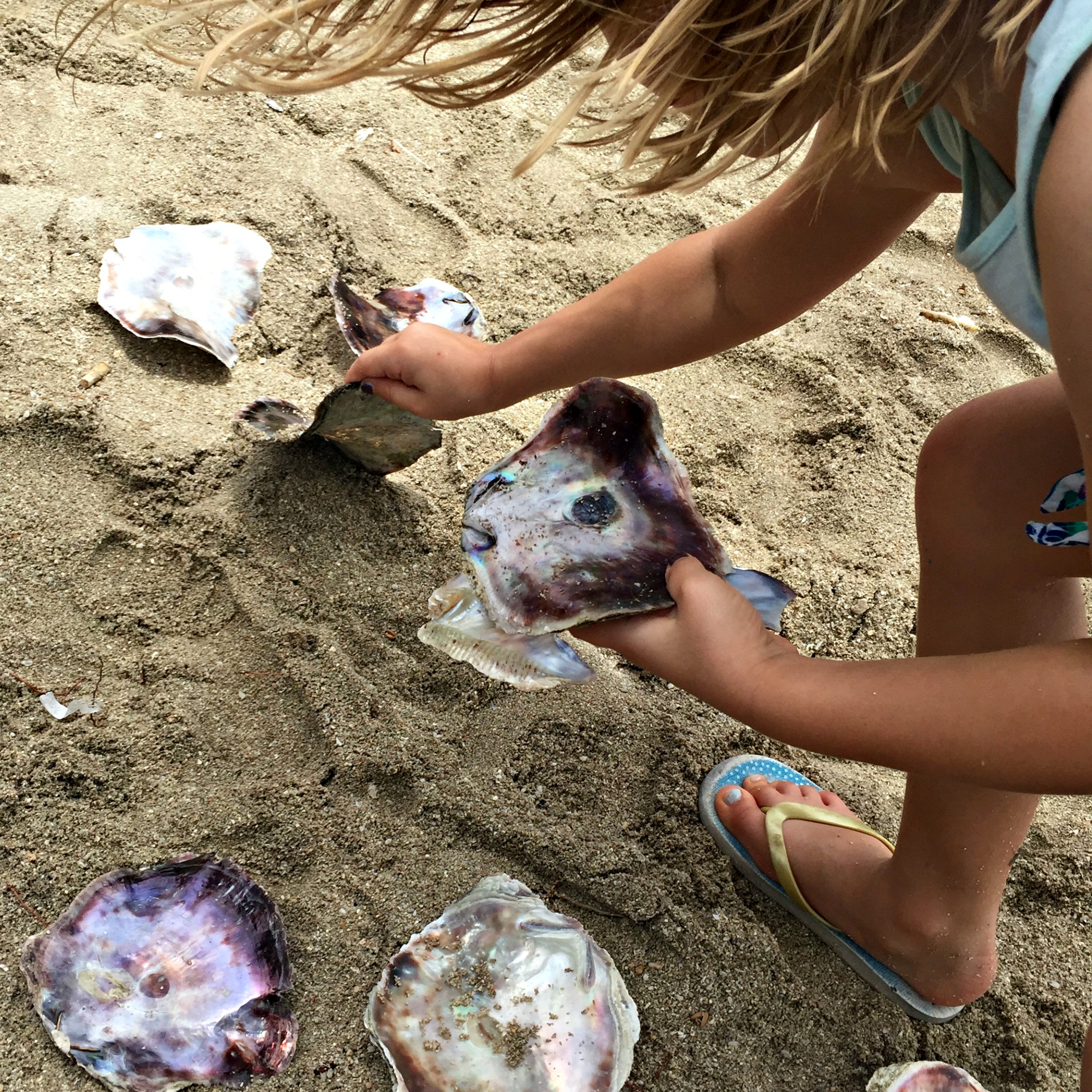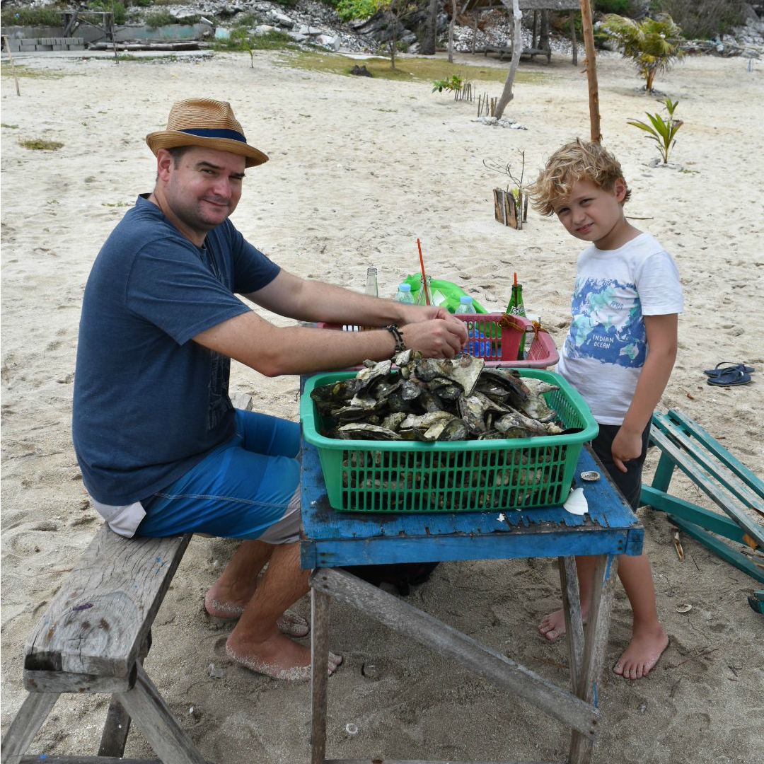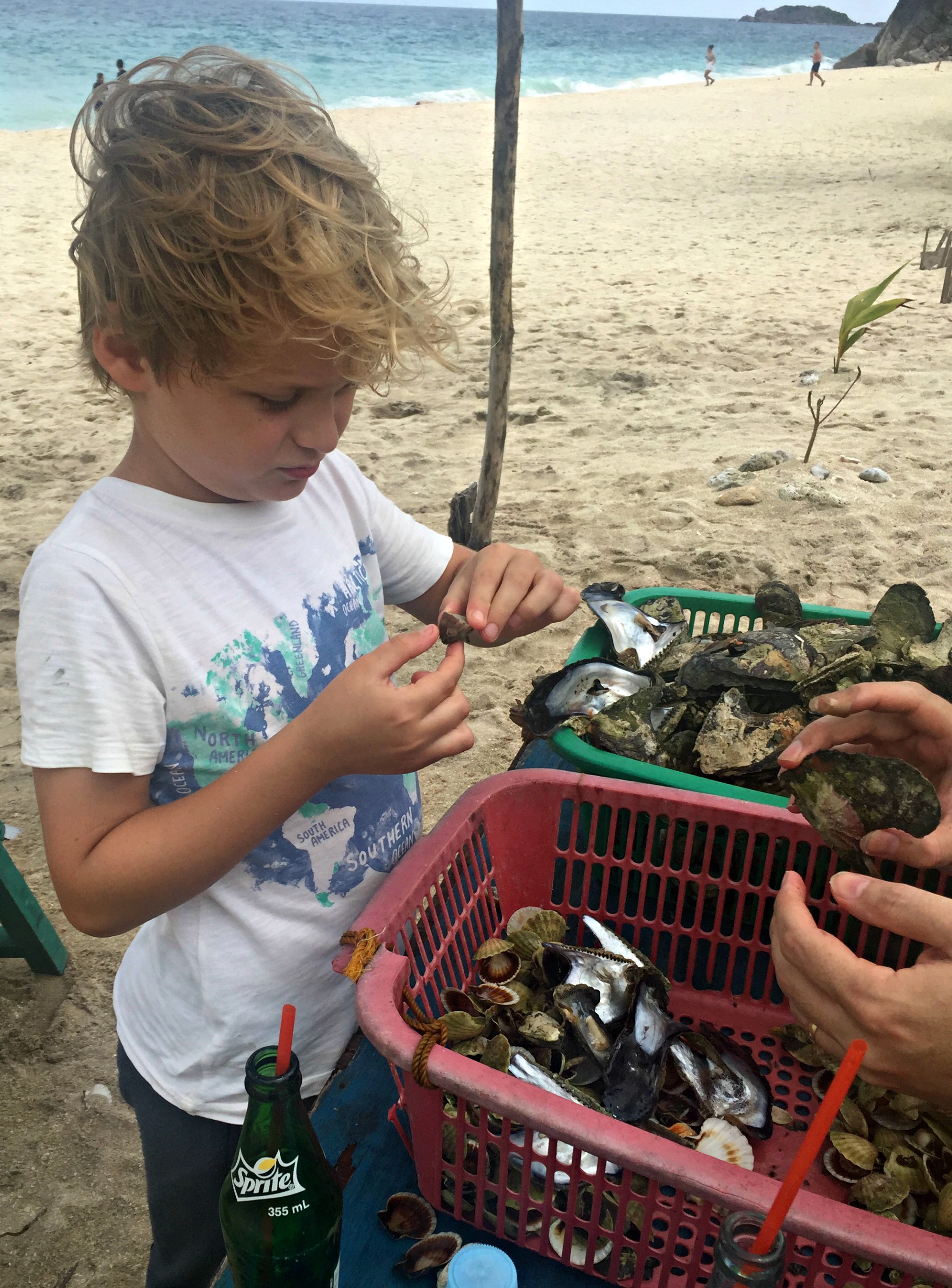 The rain passed and we got off our boat by crawling across another boat docked in front of us. We walked past the yert style tents on this side of the beach we docked at, and SB put in his order for a basket of scallops and a basket of rock oysters which were 2 pesos each (minimum orders are 100p for scallops and 200p for rock oysters). We walked past the bench tables with massive groups feasting, and SB found a little table and carried it under a tree on the beach on the other side of the island, where the waters were rougher and large waves crashed on the shore. SB found some bench seats and I sat there for a while feeling sorry for myself while SB downed beer and the kids had a marvellous time running around exploring and collecting old oyster shells, which are so pretty and shiny.