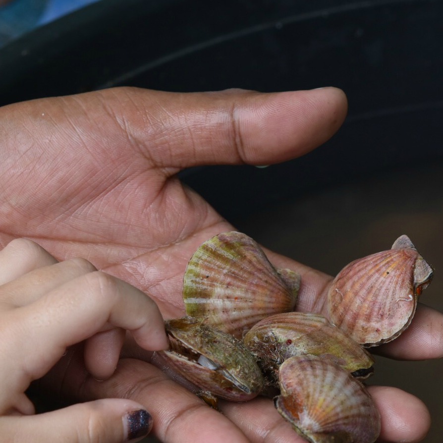 I found the tub of fresh scallops awaiting their fate sitting under the shade at the side of the sari-sari selling beers and soft drinks. Great juicy purple, green and pink lips smacking together at me. They would skim themselves across the water snapping their juicy lips together, like in a cartoon, then spit a thin stream of water out in an attempt to protect themselves. I’d put my finger in gaping mouths and they’d bite down making me squeal in delight. I felt like I was a child again. I quickly grabbed the kids to show them, but they didn’t seem to enjoy having fingers nipped by angry scallops quite the way I did…
