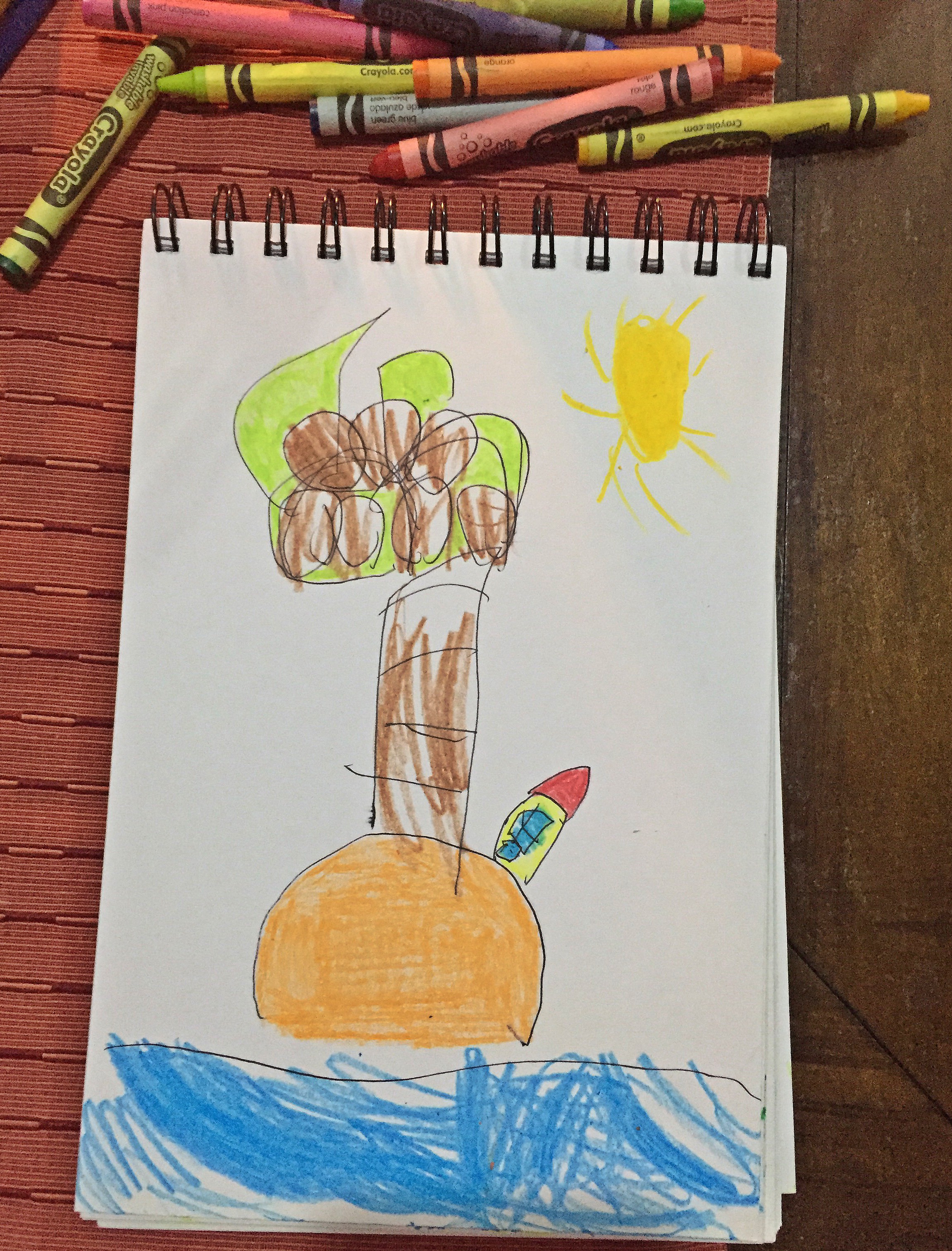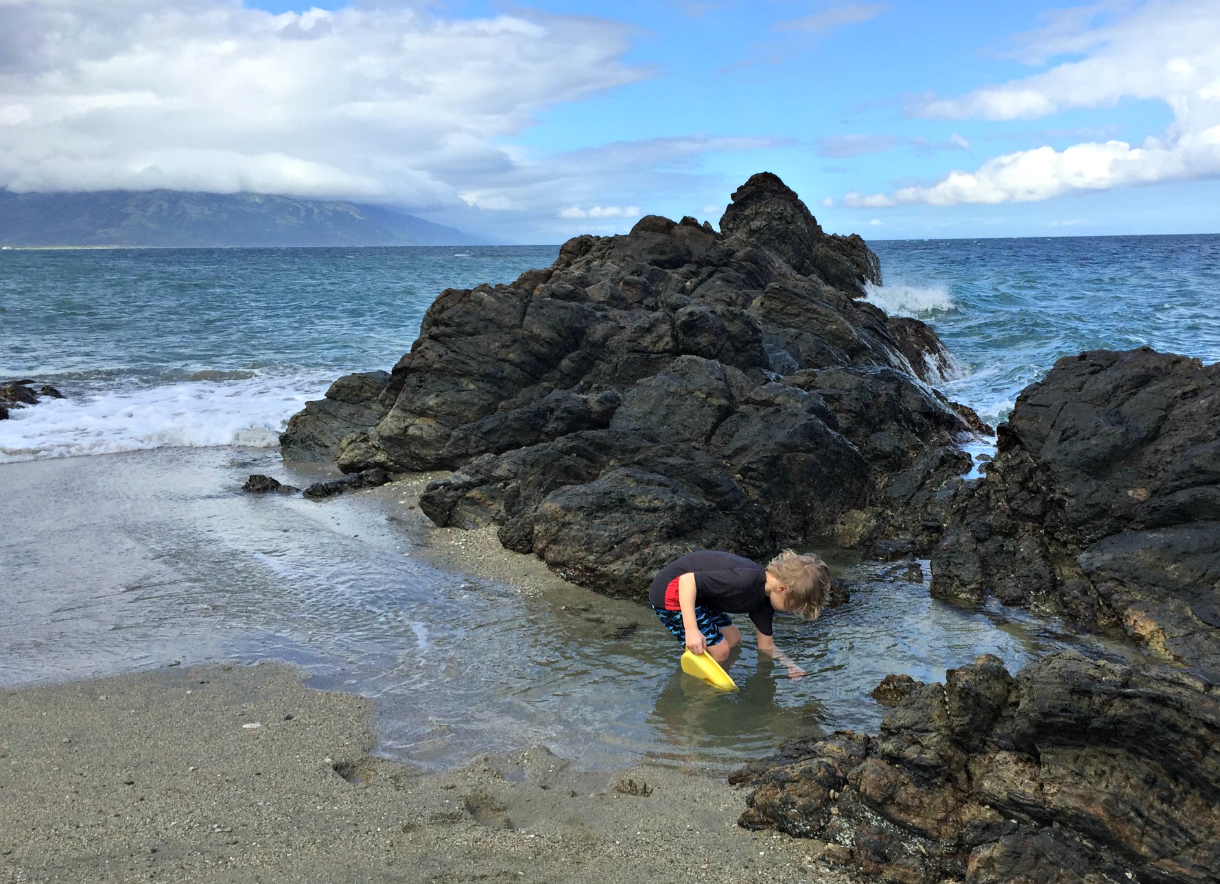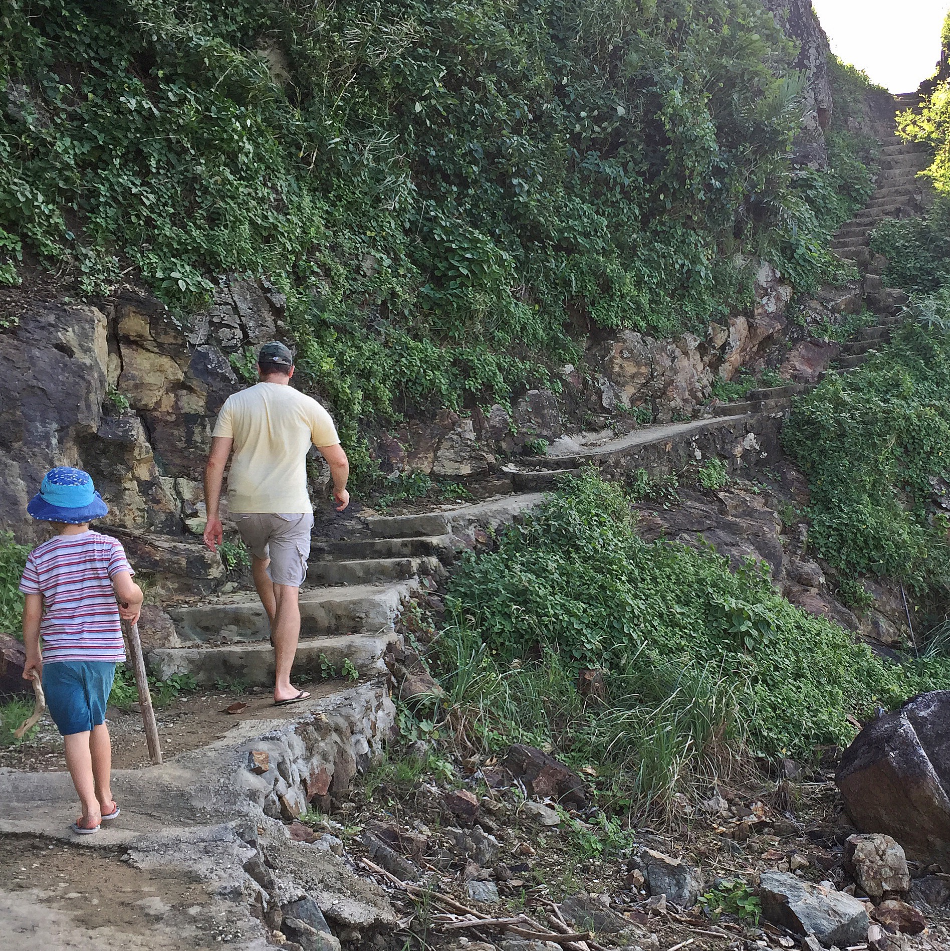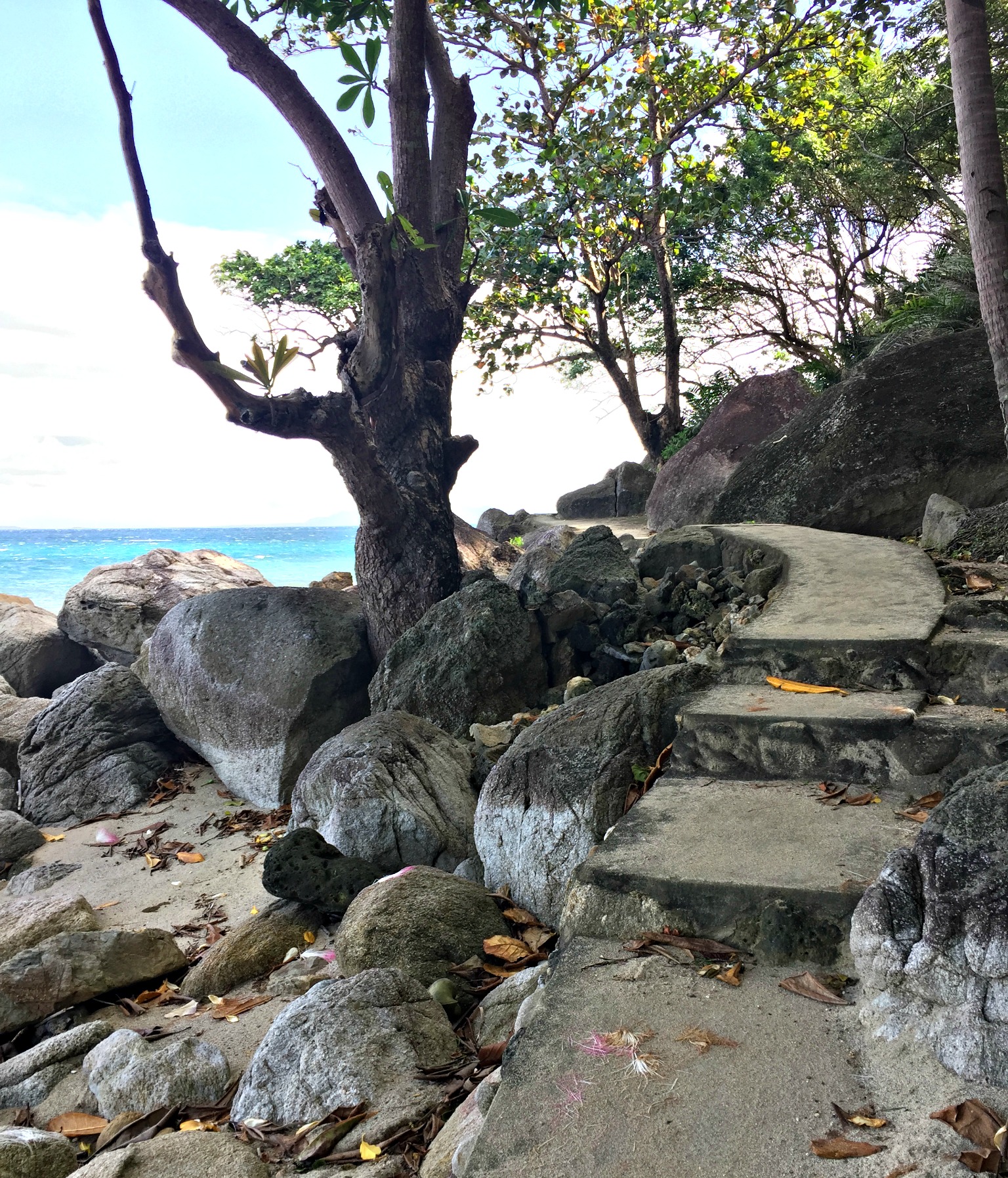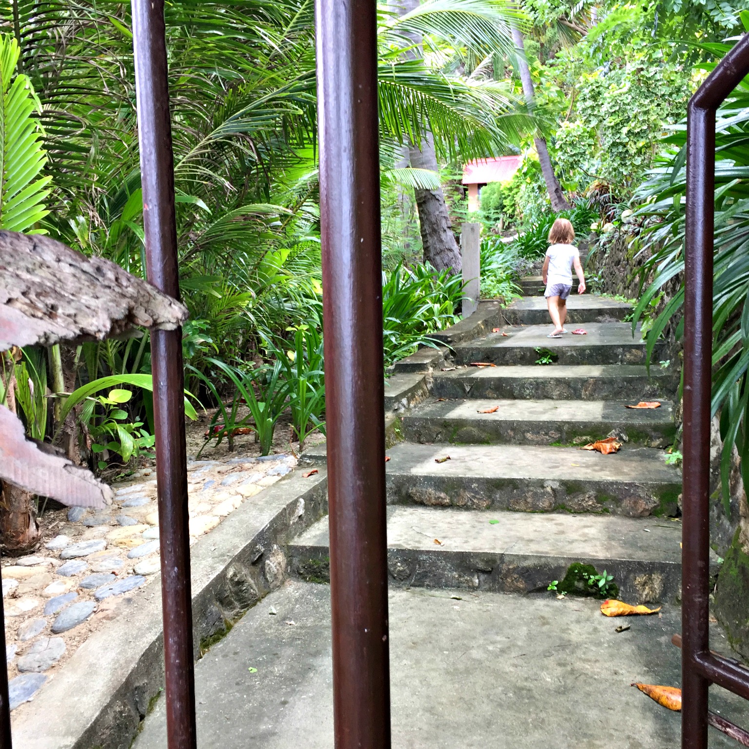 Aside from relaxing, there isn’t much to do on the island except explore. Pathways weave around the coast taking the explorer from beach to beach. On arrival, the children got busy beach combing, finding seashell treasures and building sandcastles. The sand is rough and made up of colourful rocks, coral and shells. Tiny sea critters run for cover as little fingers reach out to them. The weather was overcast, windy and a bit wet for our visit so swimming at the beach was not really available, it was just too rough. Nobody seemed to mind though. The sky and the sea were a matching gunmetal grey and clouds swept across the sky. Sunlight filtered through making the water sparkle and it felt like Perth on a winters day – wild and gusty, only still in the mid 30-degree Celsius range.