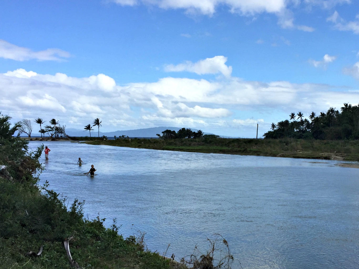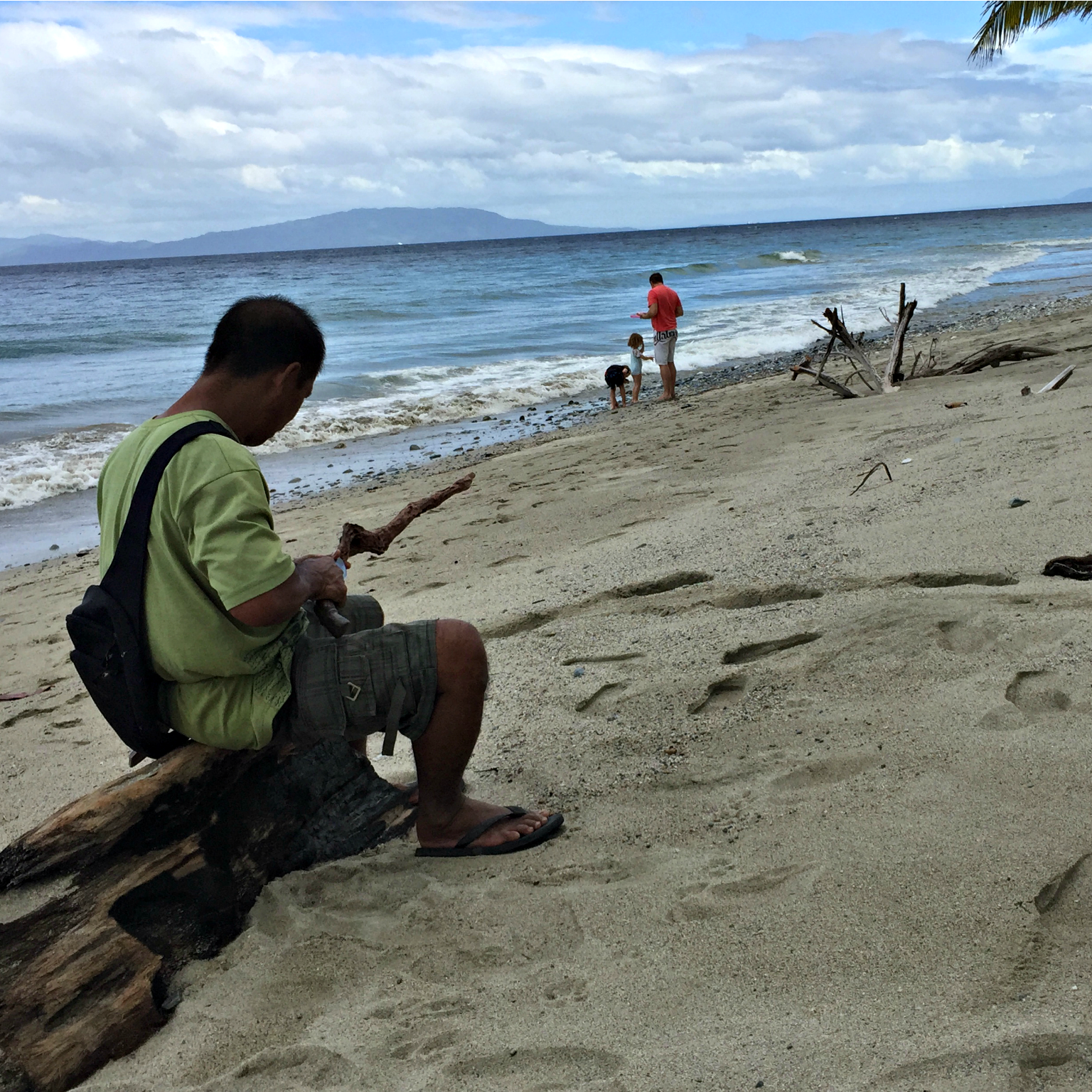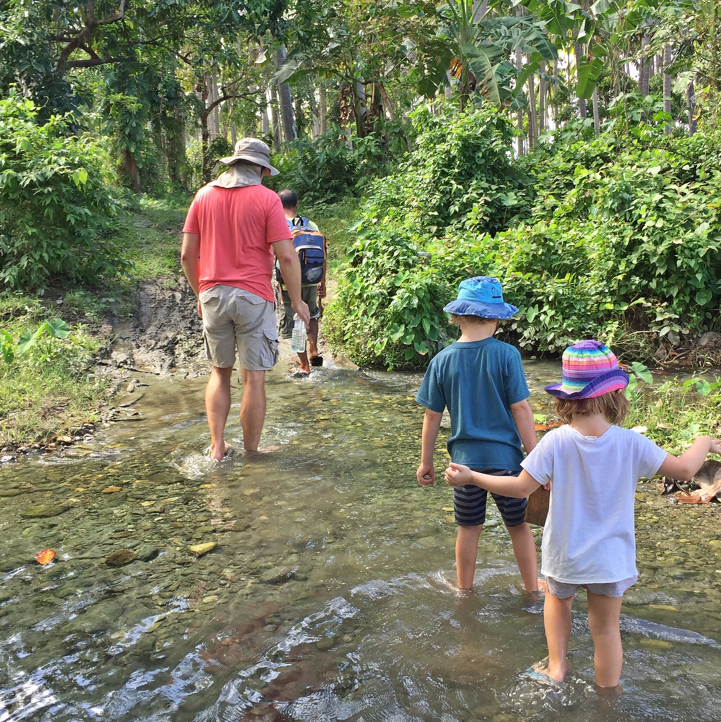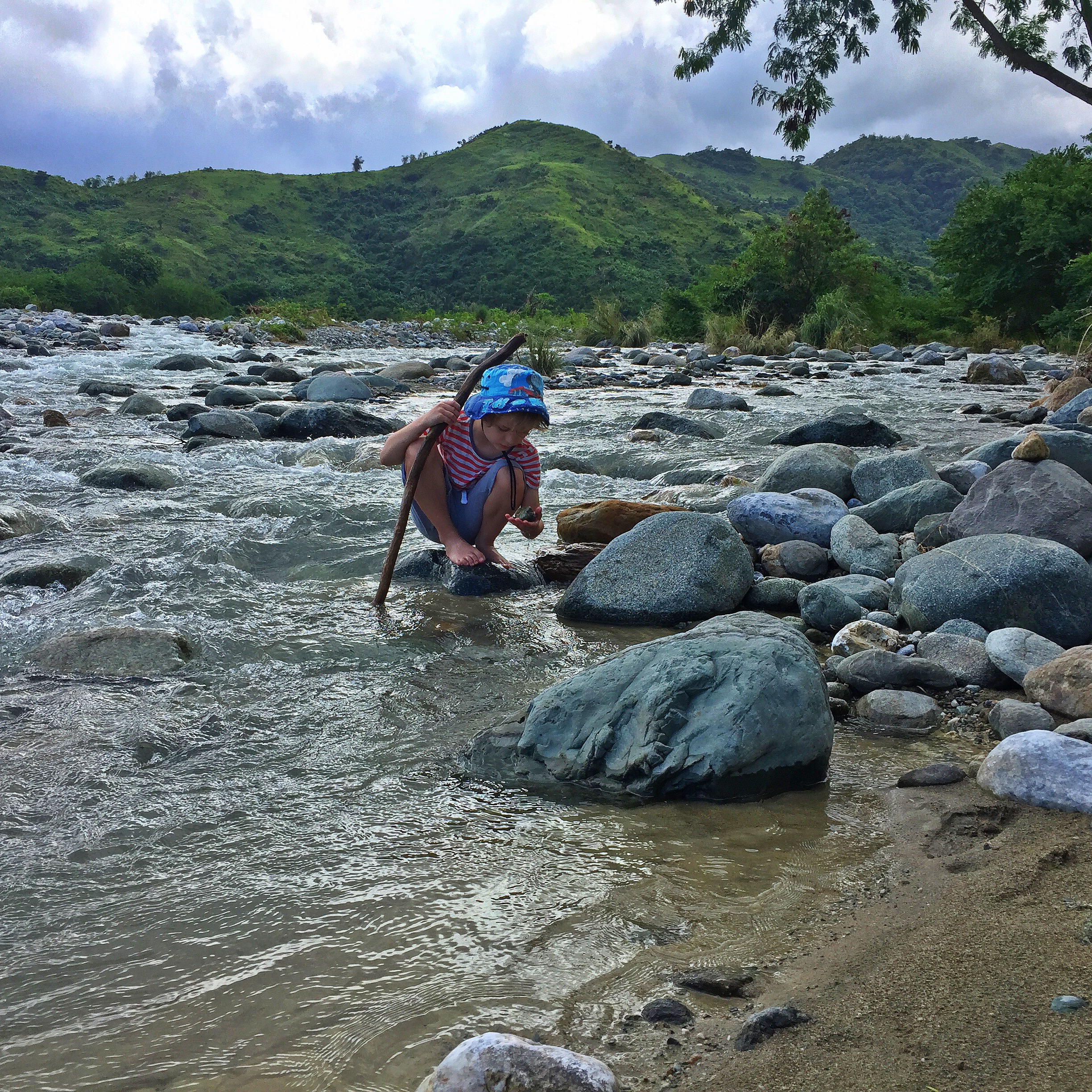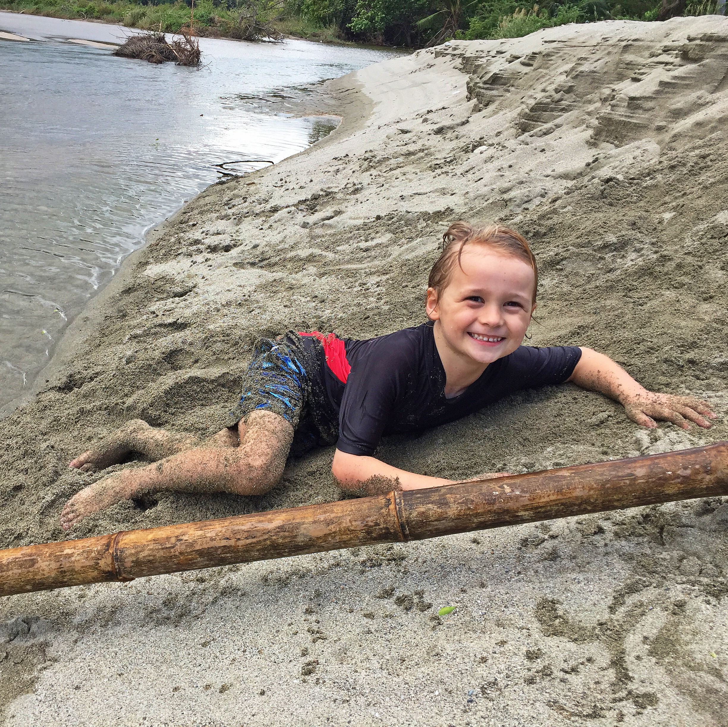 Later in our stay we met with a guide Noli and he took us on a big trek through the countryside and through different villages. We smiled at the locals and brought snacks at a sari-sari. We watched some rice being milled using machinery and looked across rice fields glowing in the sunlight. We walked up to the mouth of the second river, at Kabasingan, and the children rolled down sandbanks into the water, squealing in delight. There was this moment when I found myself standing at the point where the river met the ocean. I remember looking around and all I could see was just ocean and beach. The wind was whipping my body and I was holding my phone out, waving my arm around trying to find that current of wind on which the phone signal traveled so I could get back in touch with my world. It had been three days without contact. I remember stopping and thinking how stupid I felt, how desperate I must have looked and how really, unless my parents had contacted me there was nothing at all that could be more important than enjoying this moment with my family. This was a turning point for me in how I live with the online world. As the wind changed direction I got a weak signal and a message came through from a concerned friend. ‘I haven’t heard from you, I’m worried’. I quickly messaged back, reassuring her we were well and truly alive. I switched off my phone, turned and walked to the river where the children and SB were getting muddy, swimming and having a glorious time being swallowed up in rapids and quicksand (not real quicksand, just really wet mud that makes you sink to your thighs, making big farting noises as you pull yourself out, much to the delight of the children).