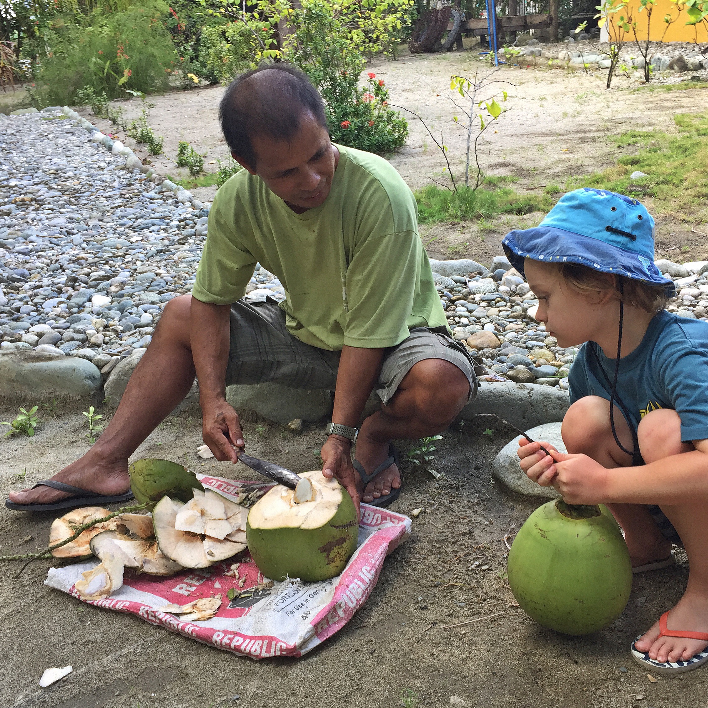 After our tour Noli took us to his home and collected fresh buko for us to snack on. We hung out chatting to his wife Chanda and an American couple who were staying on the premises through Airbnb while Chandra’s mother showed the children how to feed the baby chickens. Â